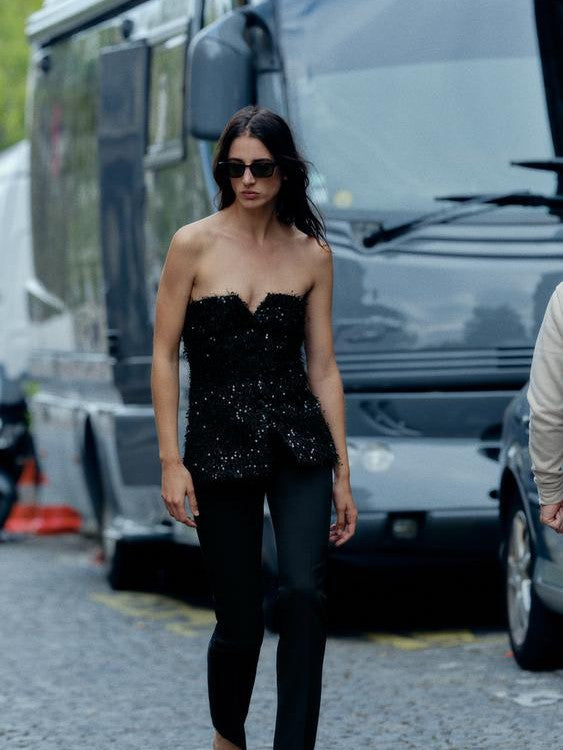 Strapless bustier top with a straight neckline. Featuring fringe and sequin appliqués and matching button fastening at the front.