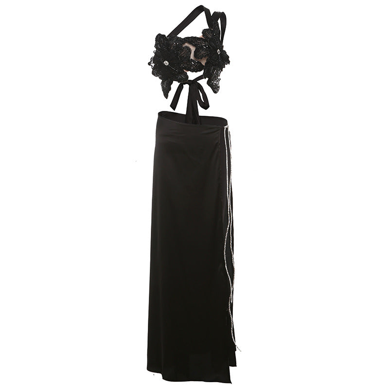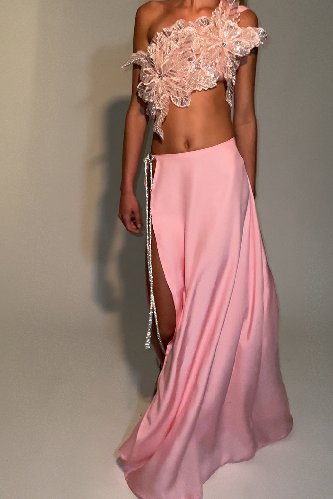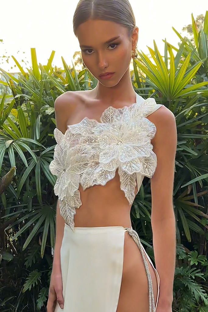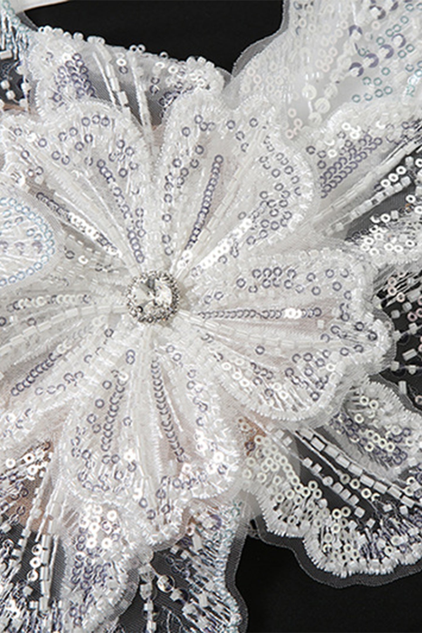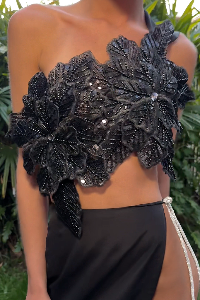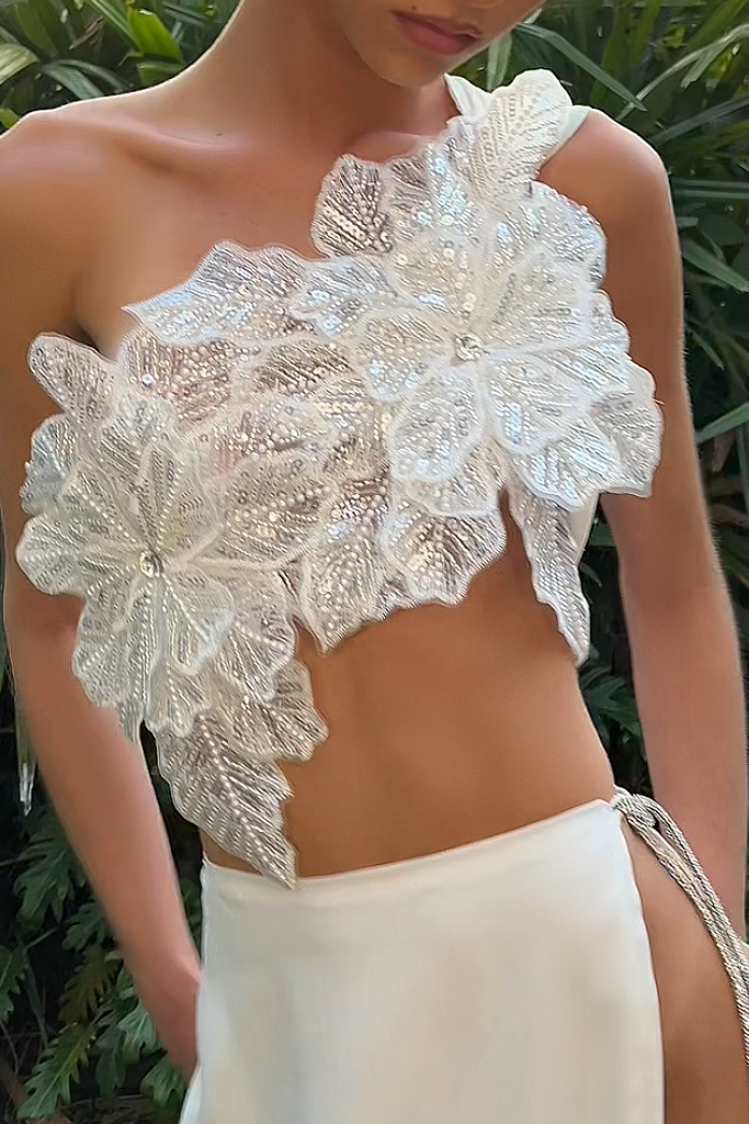 Embellished Sequin, Embroidered Floral Details, Draped Skirt, Mini Length.