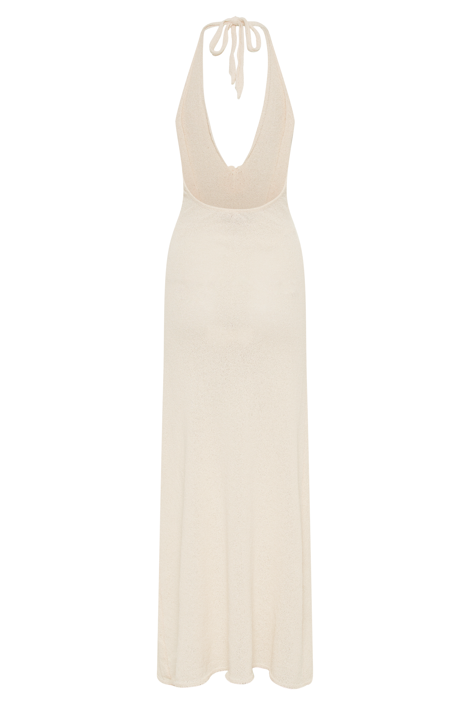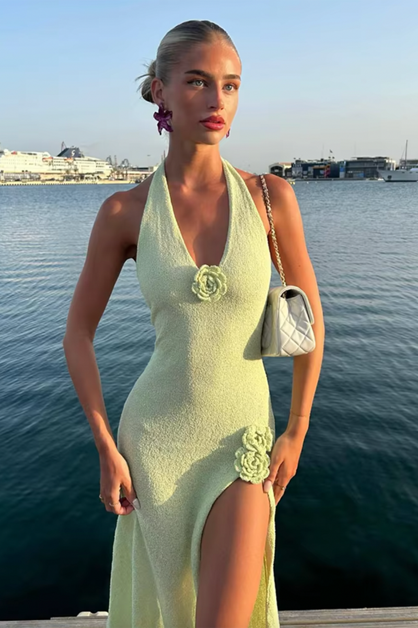 V Neckline, Halter Neck, Flower Applique, Open Back, Maxi Length.
