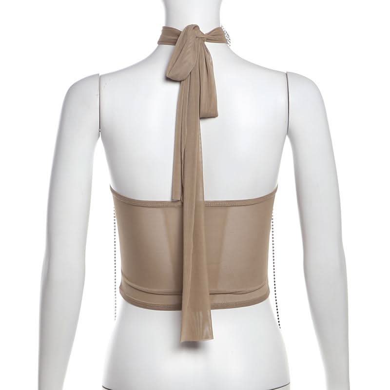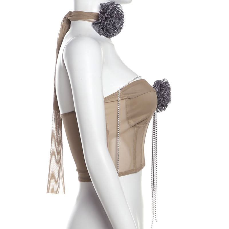 Beaded metal chain flower applique mesh tube top