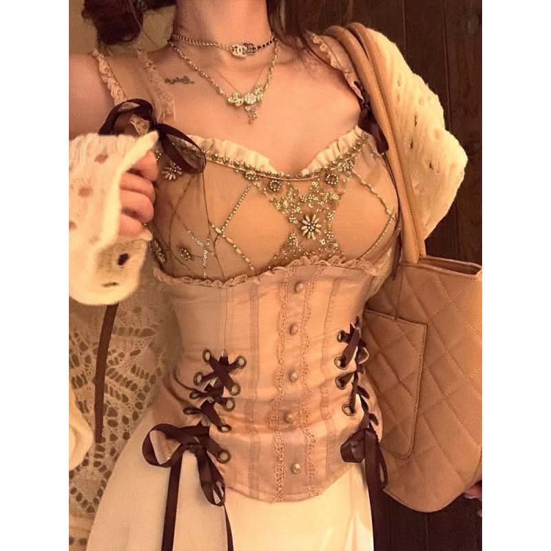 Beaded satin lace up button cami top