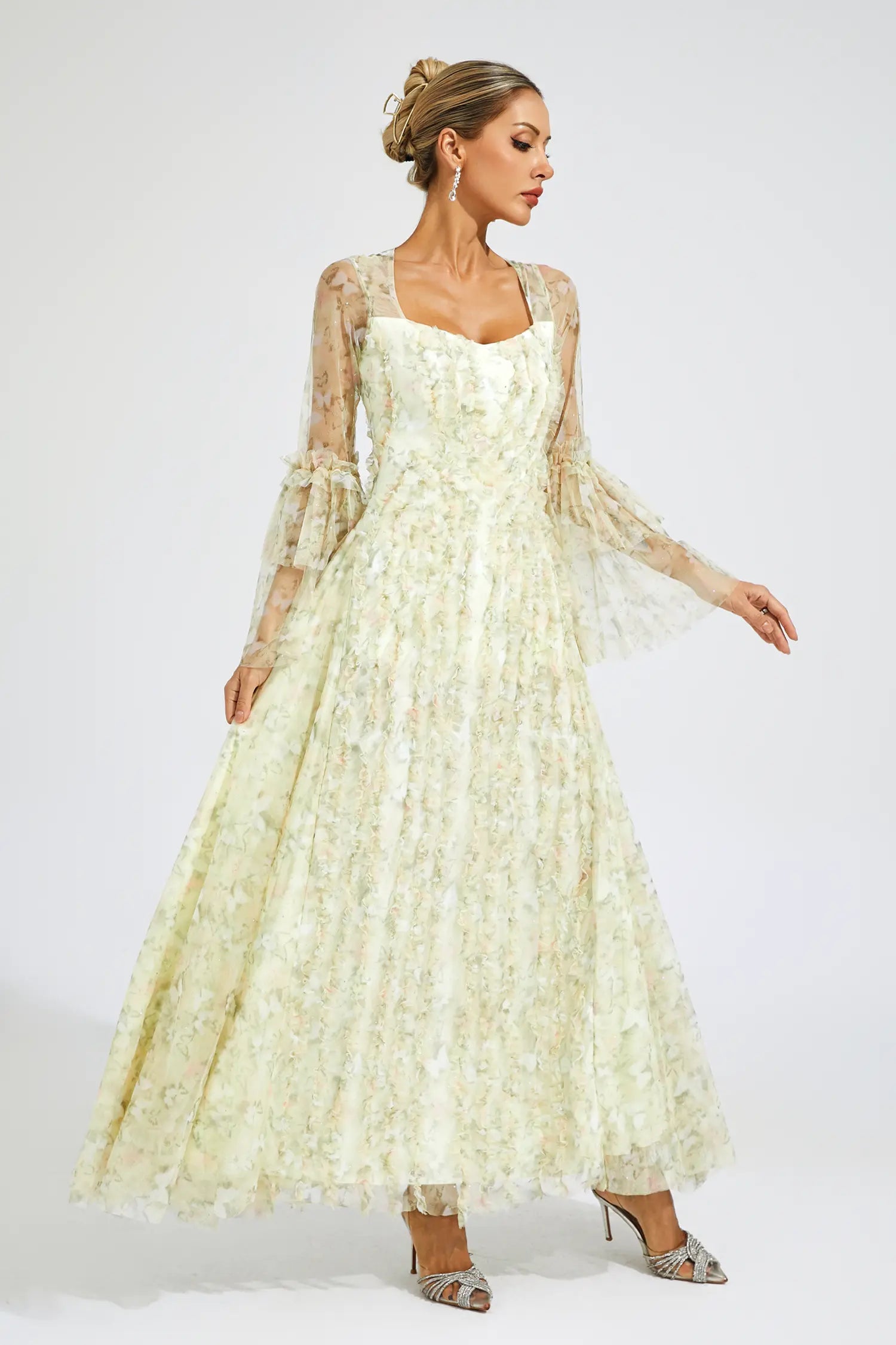 The Becky Yellow Mesh Floral Maxi Dress is a chic and elegant addition to your wardrobe. With its fresh and sweet floral print, this dress exudes feminine charm. The U-neckline and flared sleeves add a touch of sophistication, while the glittering details give it a subtle sparkle. Perfect for special occasions or dressing up, this dress is a must-have for fashion-forward women.