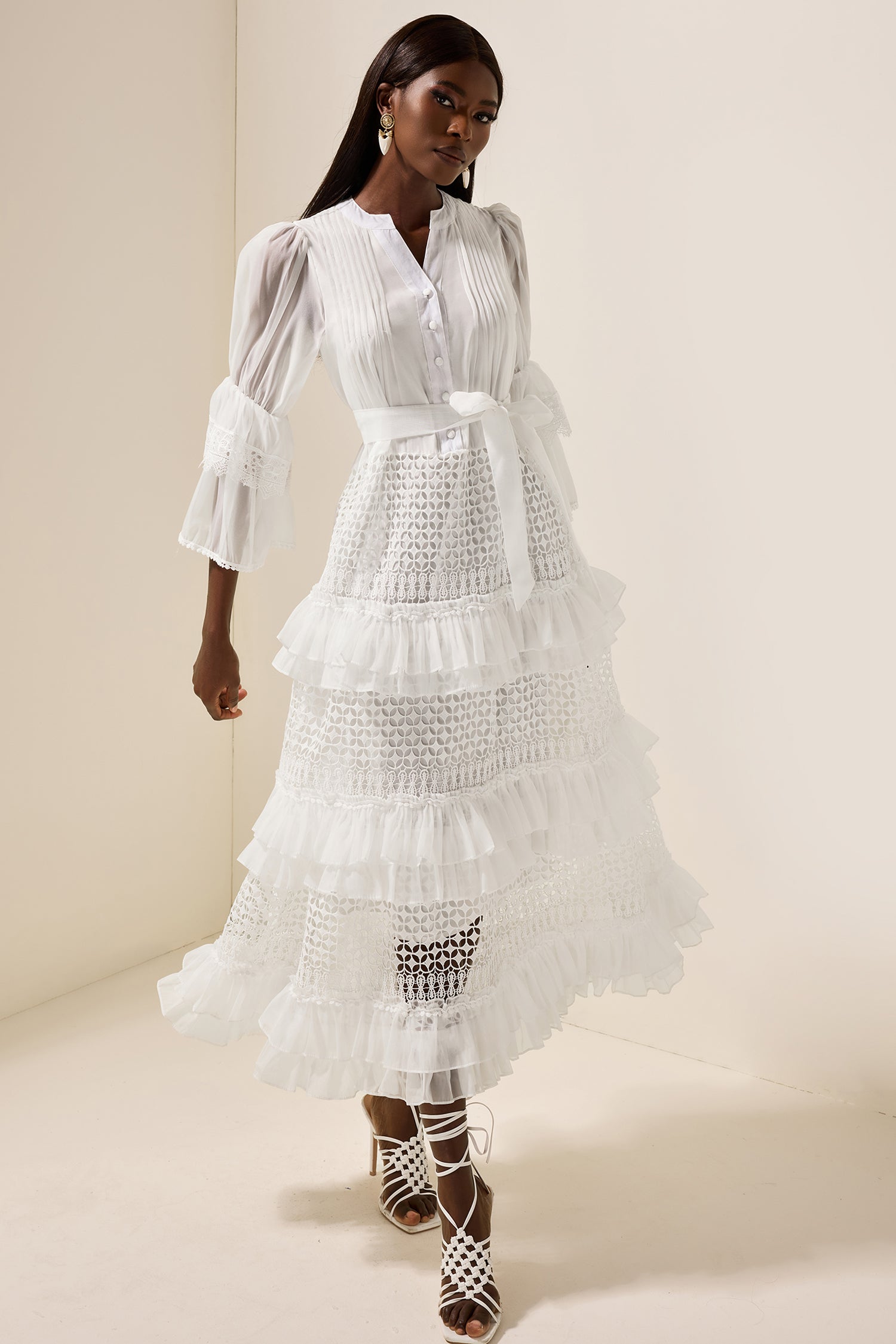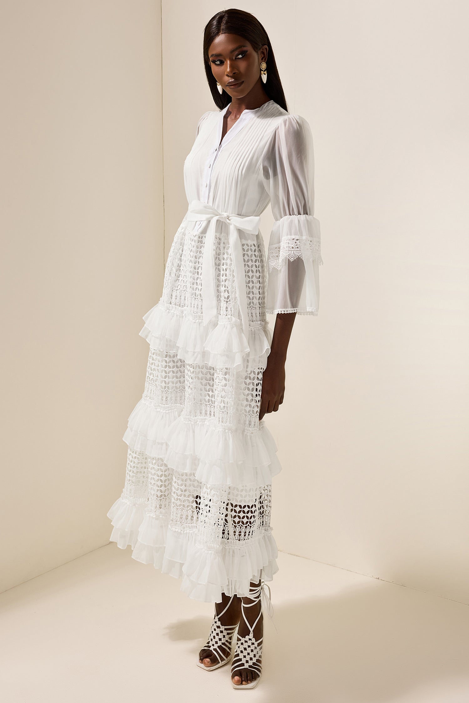 - Long sleeve, bell sleeve, frill lace, white, midi dress