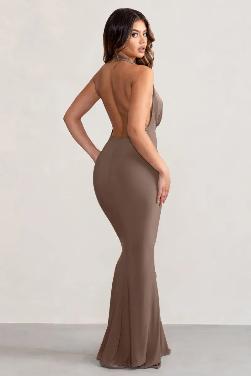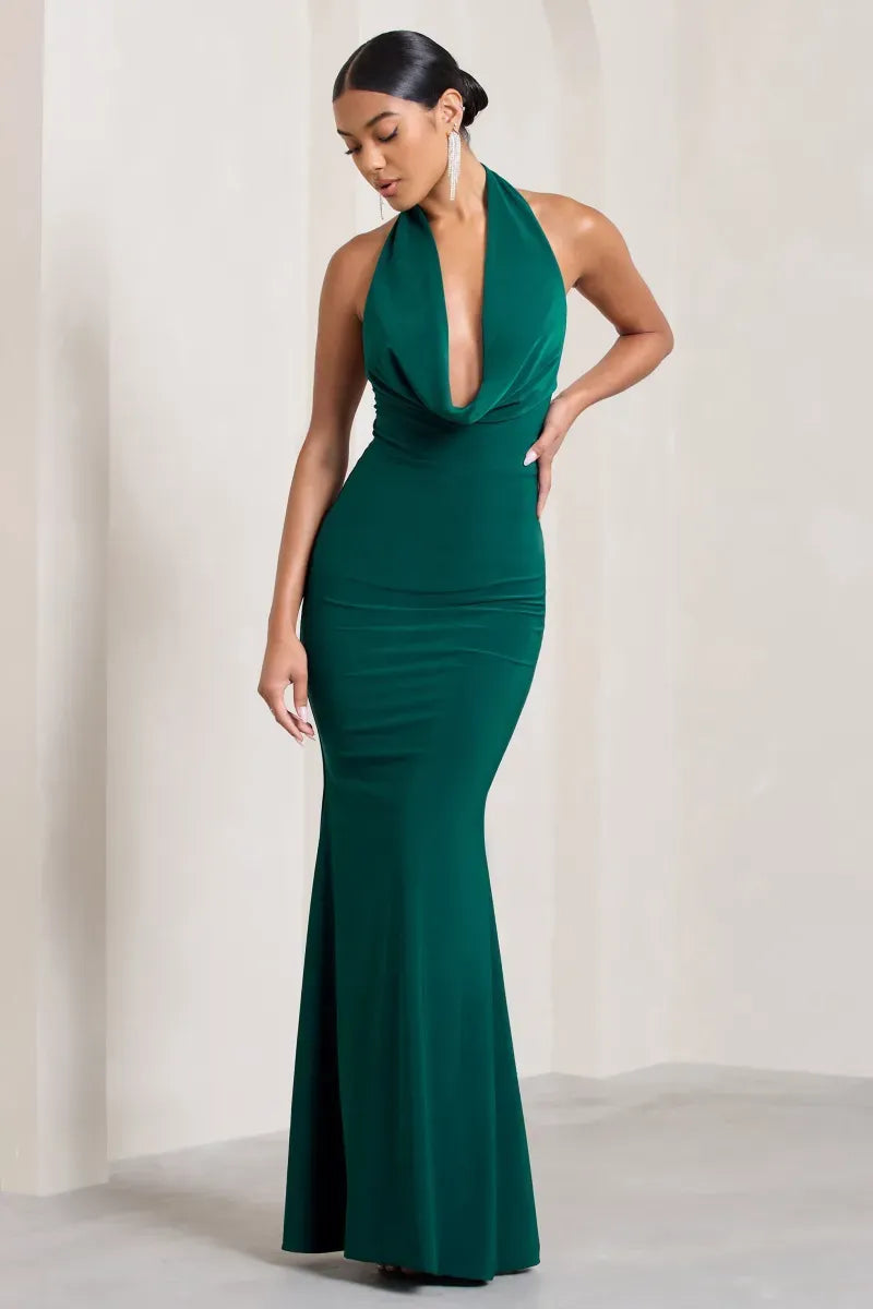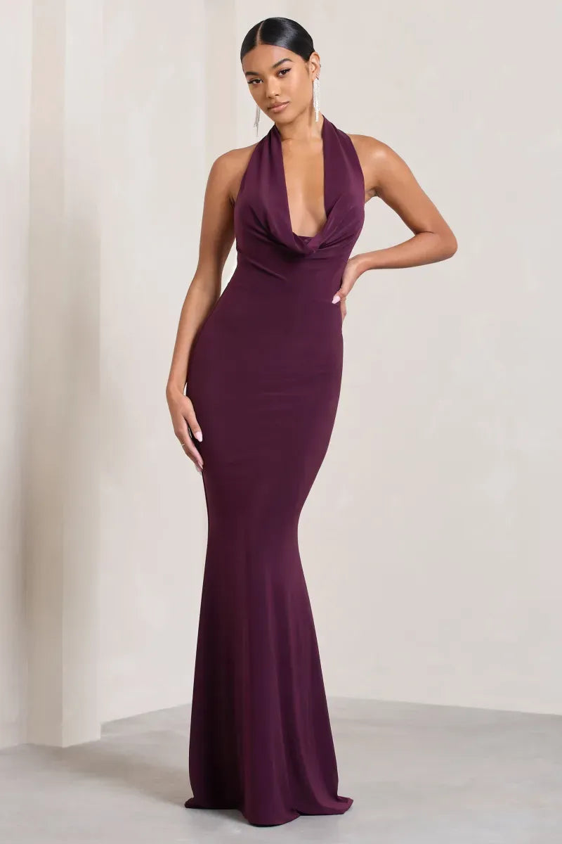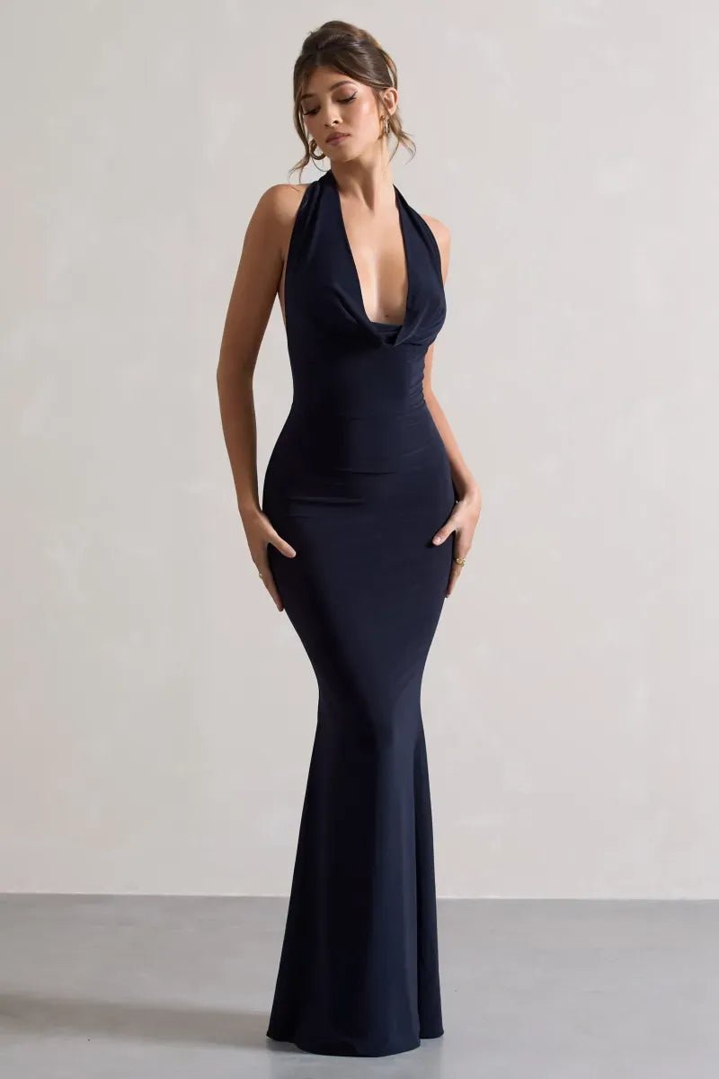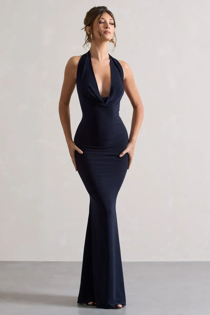 Step out in style in this beautiful sexy maxi dress. Perfect for making an entrance, this navy maxi dress features a plunging cowl neck, scoop back design and curve contouring fishtail silhouette to highlight those curves in all the right places. Crafted in our premium jersey fabric, it is the ultimate event dress that will never go out of style.