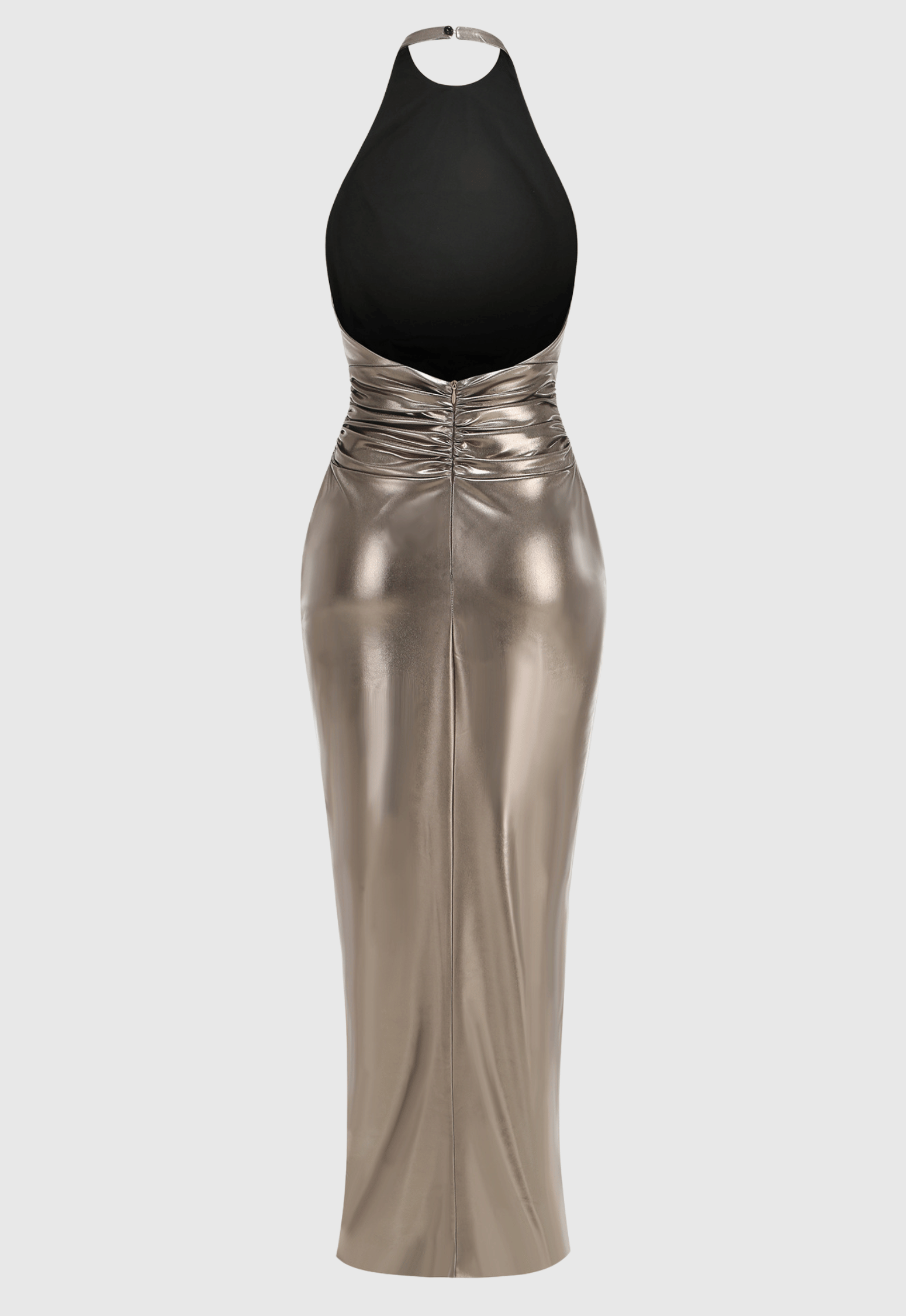 Berton Gold Halter Ruched Backless Split Maxi dress