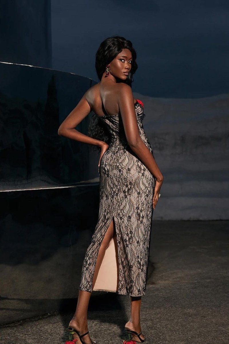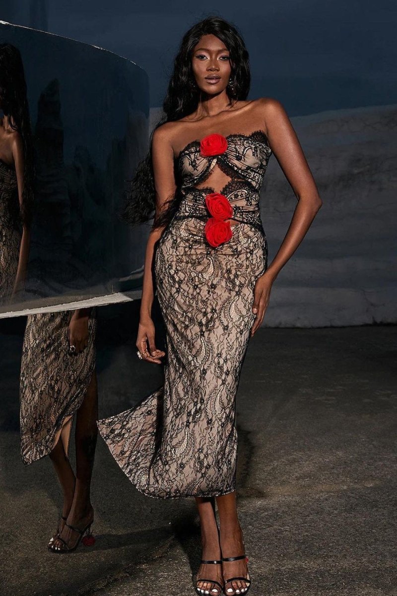 - Corset, Cut-Out, Three-dimensional Floral Accents,Maxi Length.