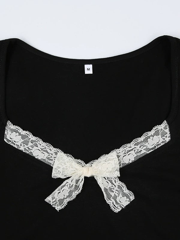 Black Lace Trimmed V Neck Ribbon Long Sleeve Top