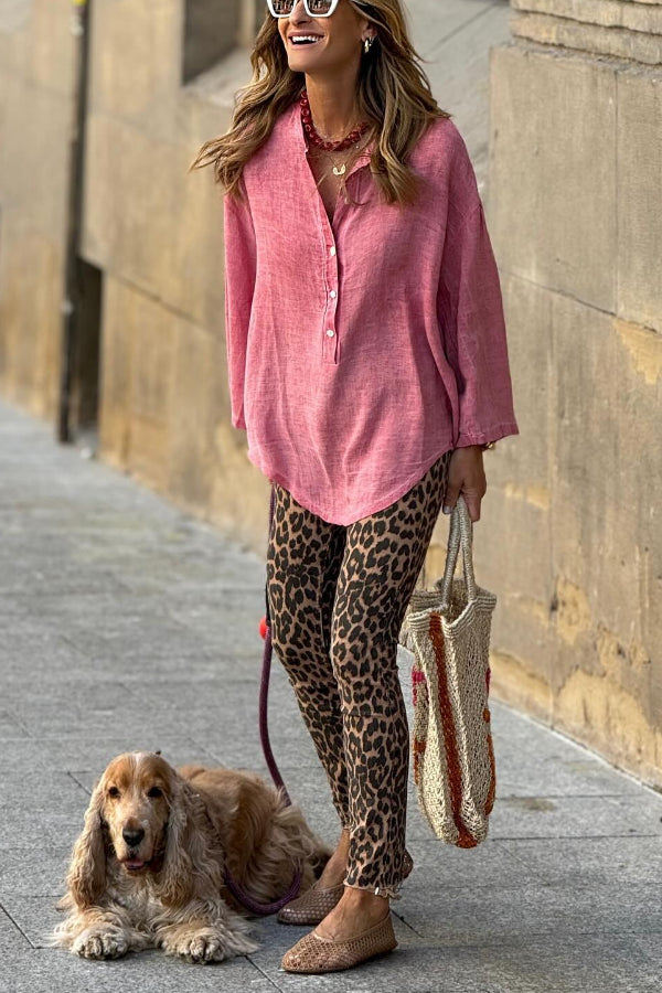 • Shirt with mao V-neck buttoned with 5 buttons. Finished long sleeve. Slightly asymmetric hem. One size adaptable from 36 to 44. Composition: 50% viscose and 50% linen.