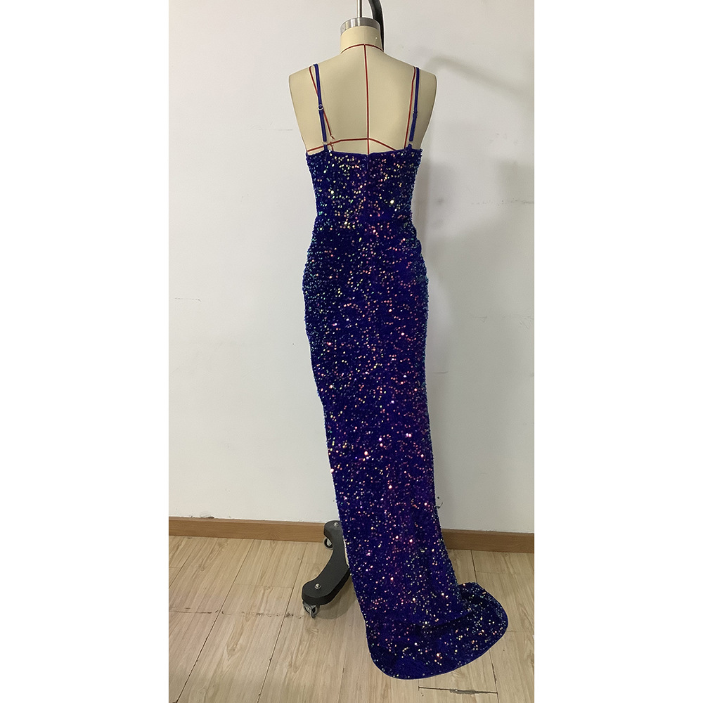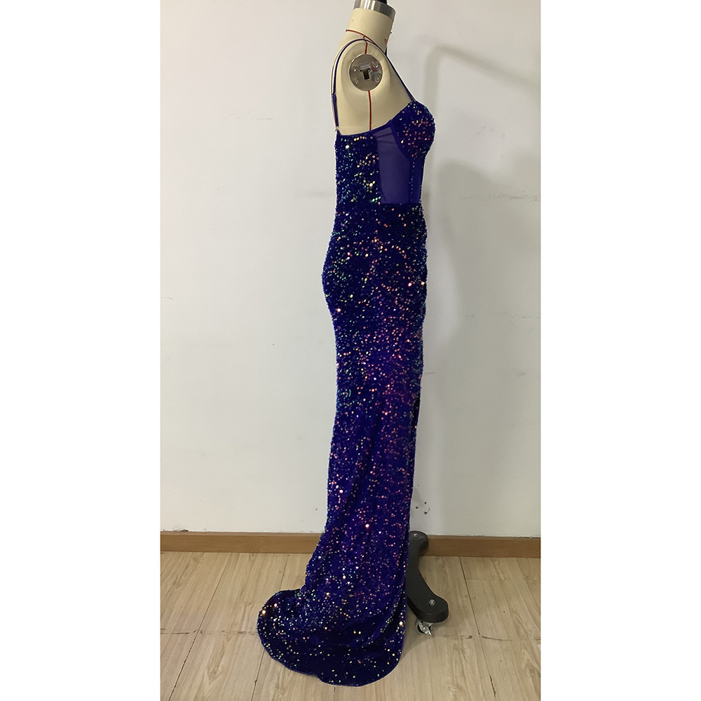 Blue Irregular Asymmetric Velvet Sequin Sling Maxi Dress