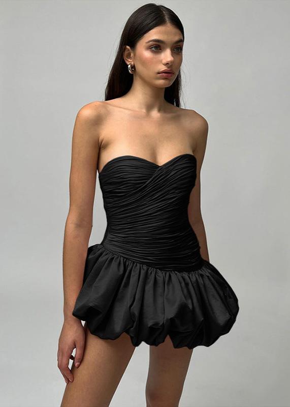 The Blush Satin Bubble Mini Dress exudes playful elegance with its strapless ruched bodice and voluminous bubble hemline. Designed from luxurious satin, this mini dress contours to perfection while offering a soft and lustrous finish. The structured silhouette and flirty cut make it a standout choice for cocktail parties, weddings, or date nights. Pair it with metallic heels and statement earrings to complete the look.