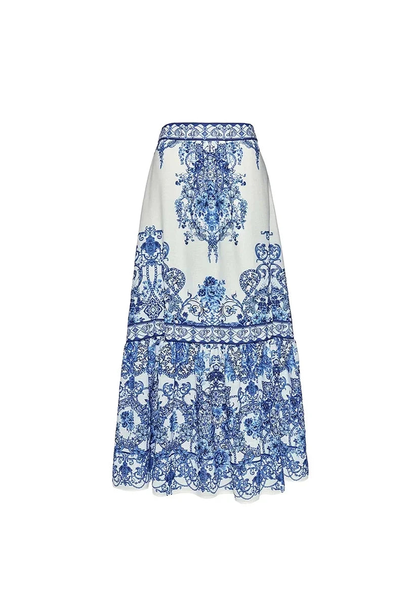 This blue boho print one-piece swimsuit set features delicate bow tie shoulder straps and an intricate ethnic-inspired pattern that brings a relaxed, free-spirited vibe to your beachwear. The soft blue tones and detailed print evoke a sense of wanderlust, while the adjustable ties add a touch of charm and a customizable fit. Crafted from high-quality stretch fabric, the swimsuit hugs the body comfortably and flatters your shape, making it both stylish and easy to wear for any warm-weather escape.