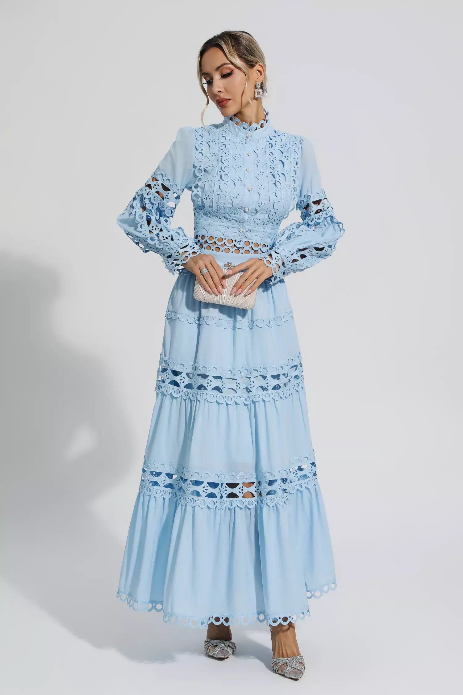 A wardrobe item full of personality - Bonnie Blue Lace Hollow Set. Look your best in this elegant, vintage two-piece set. Crafted in luxurious lace, the set includes a long-sleeved top with pearl and an A-line cutout skirt. This set is the perfect blend of sophistication and femininity. The romantic French style will make you stand out when you are on vacation or attending a wedding.