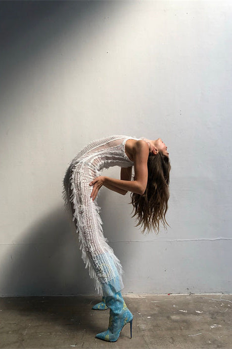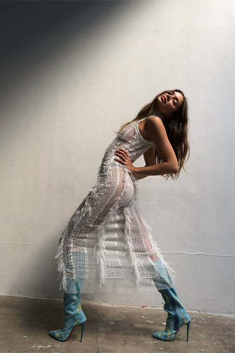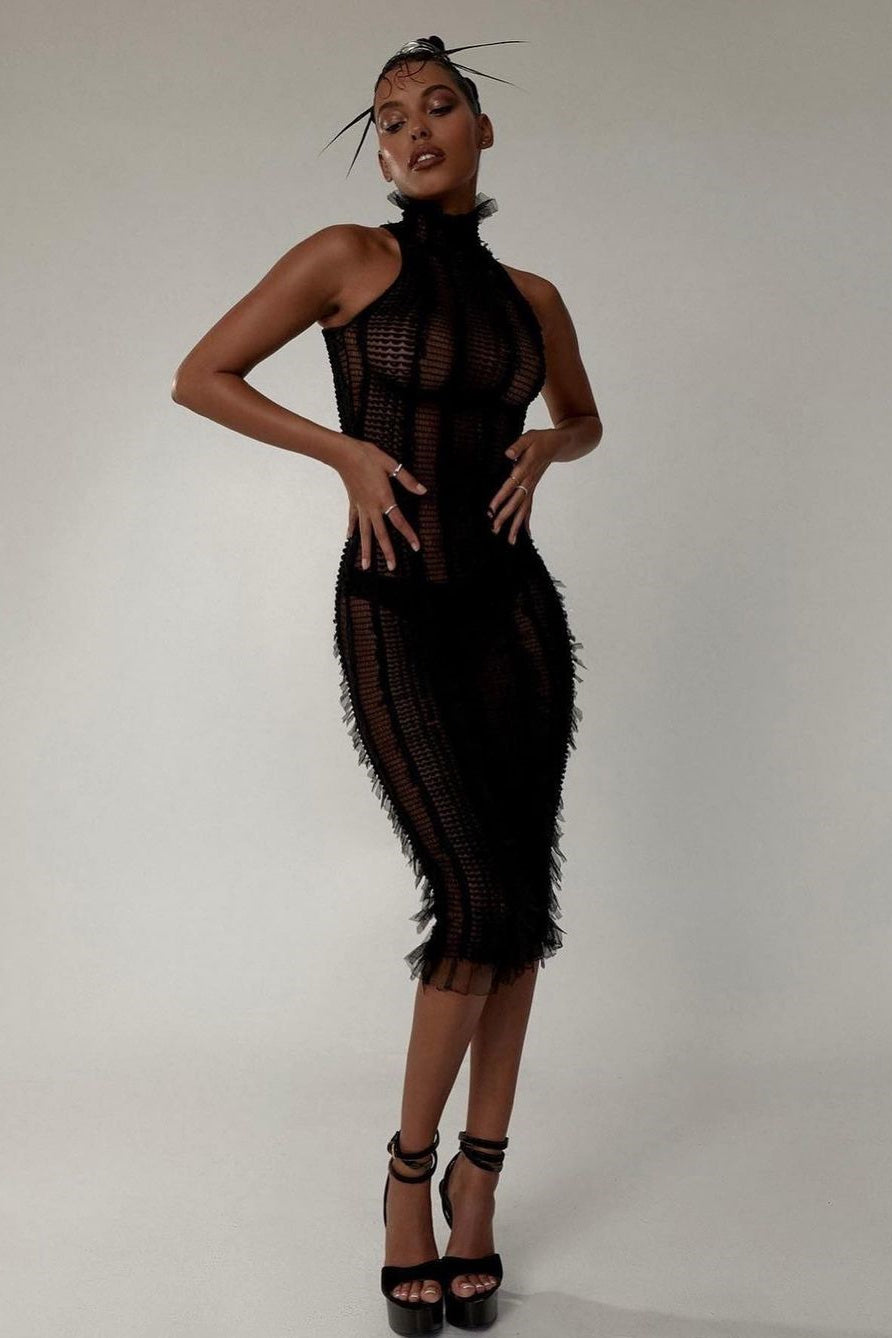 Mock Neckline, Sleeveless, Crochet, See-Through, Midi Length.