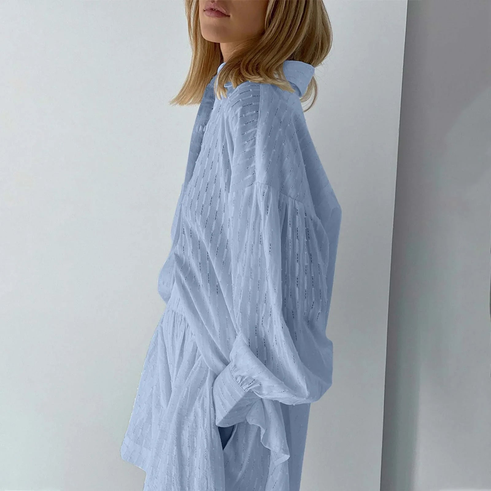 The Breezy two-piece summer outfit is designed for the modern woman who values both style and comfort. The top features puff sleeves and a turn-down collar, adding a touch of femininity to the overall look. The shorts come with convenient pockets, offering functionality without compromising on style. The elastic waist ensures a comfortable fit, and the slight stretch in the fabric allows for ease of movement.