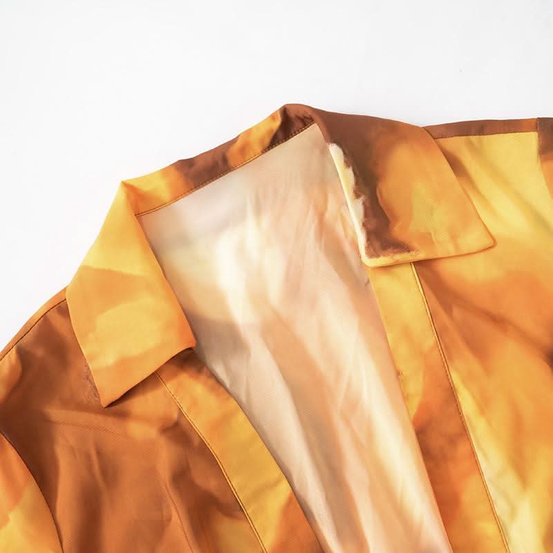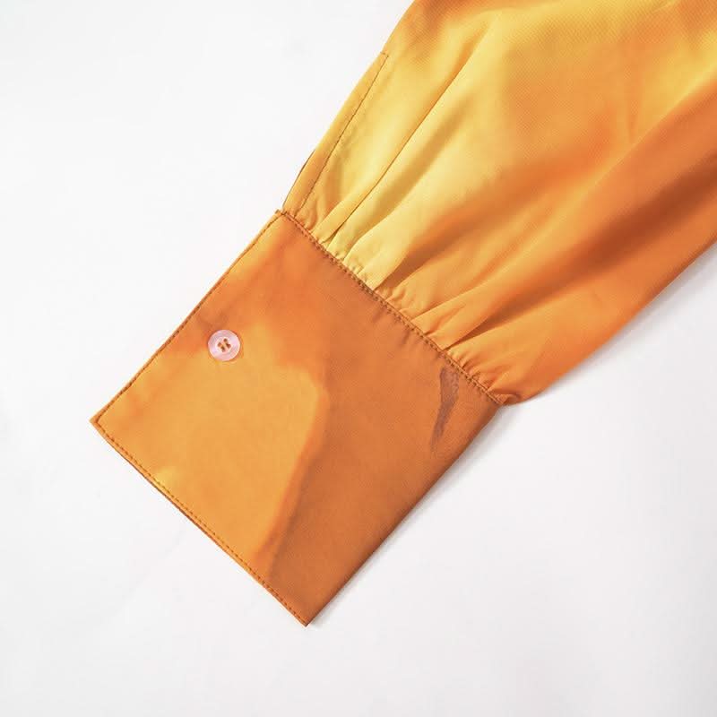 Button long sleeve ruched turnover collar print top