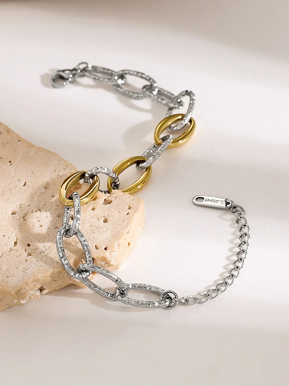 The Camila Link Bracelet, crafted from 100% titanium steel, features a timeless link design that adds a touch of elegance to any outfit. Its durable construction ensures long-lasting wear, making it a versatile and stylish accessory.
