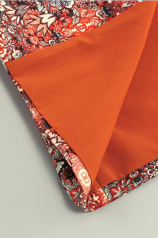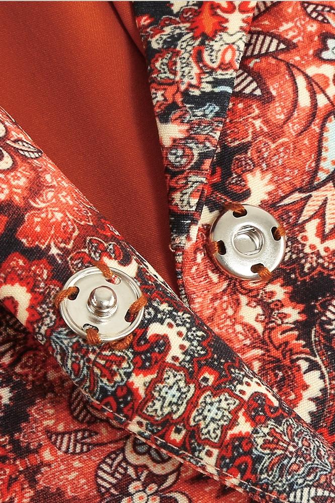 - Abstract Paisley Print, Feather Sleeves, V-neck Lapel, Belted, Padded Shoulder, Mini Length.