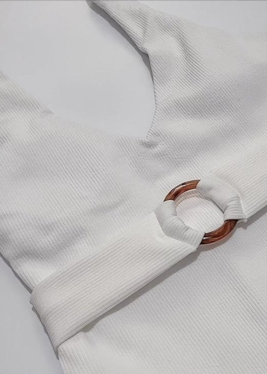 The Carmela One-Piece Swimsuit combines a sculpted silhouette with a modern textured finish and a flattering belted waist. Featuring a deep V neckline and a tortoiseshell buckle detail, this swimsuit is crafted from ribbed stretch fabric that offers both comfort and support. The wide straps and full coverage at the back provide a secure fit for confident movement. A sleek choice for poolside lounging or beach adventures.