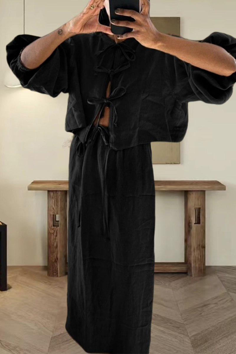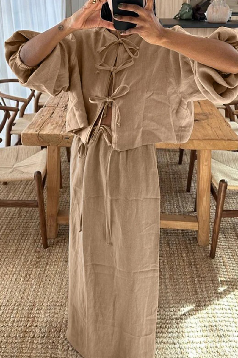 Casual Daily Solid Color Lace Up O Neck Long Sleeve Two Pieces(4 Colors)