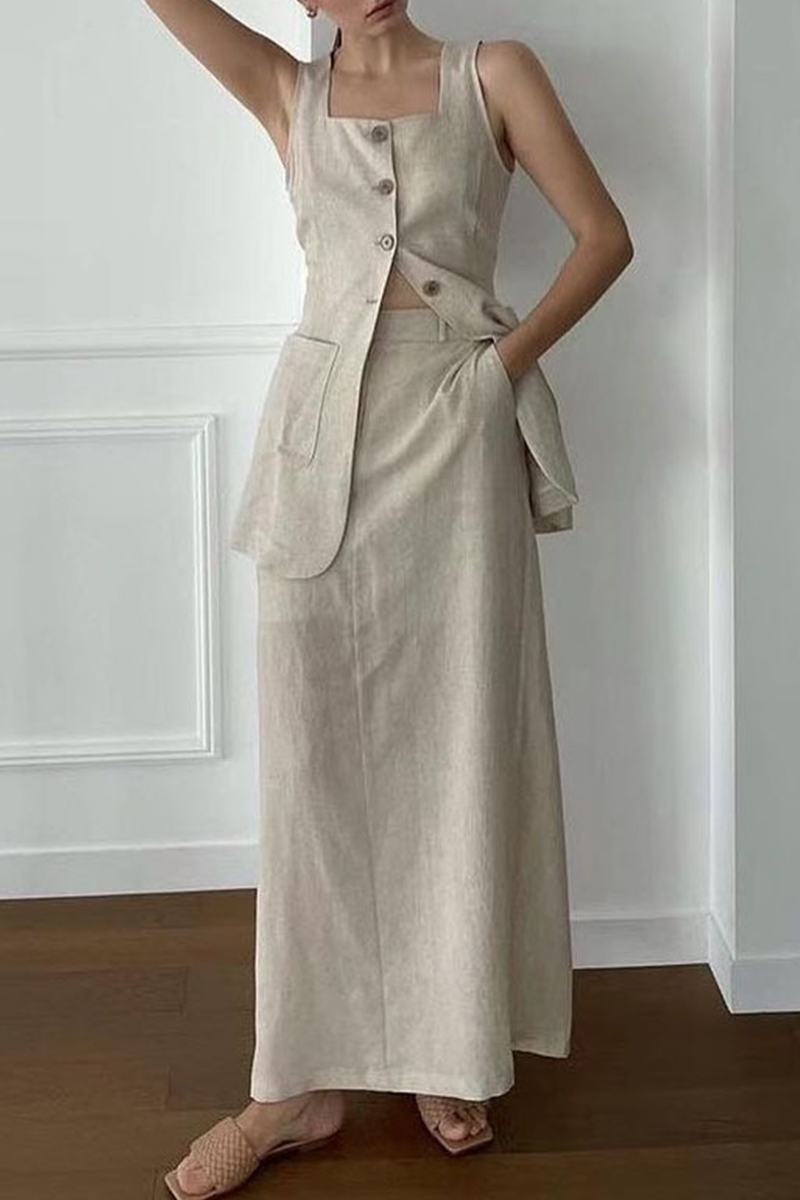 Casual Daily Solid Color Pocket Buttons Square Neck Sleeveless Two Pieces