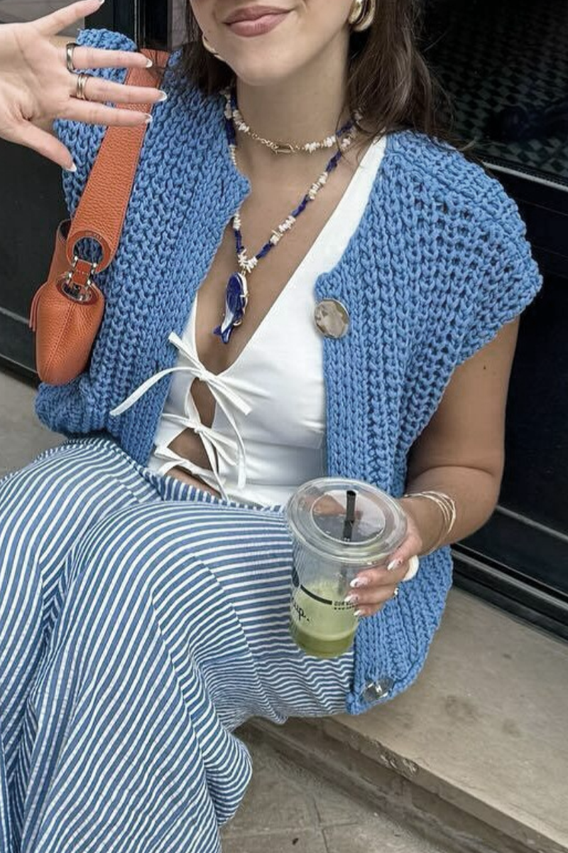 Casual Daily Solid Color Pocket Buttons Weave O Neck Tops(3 Colors)