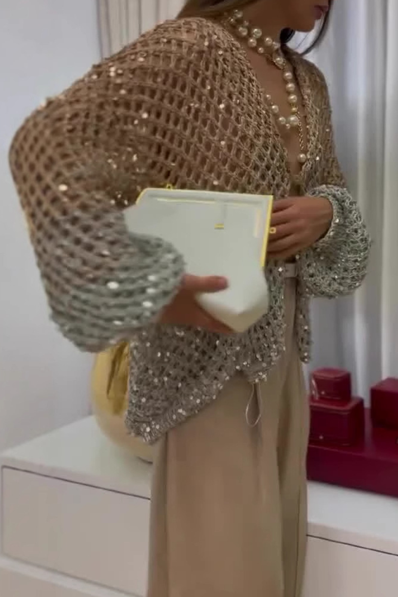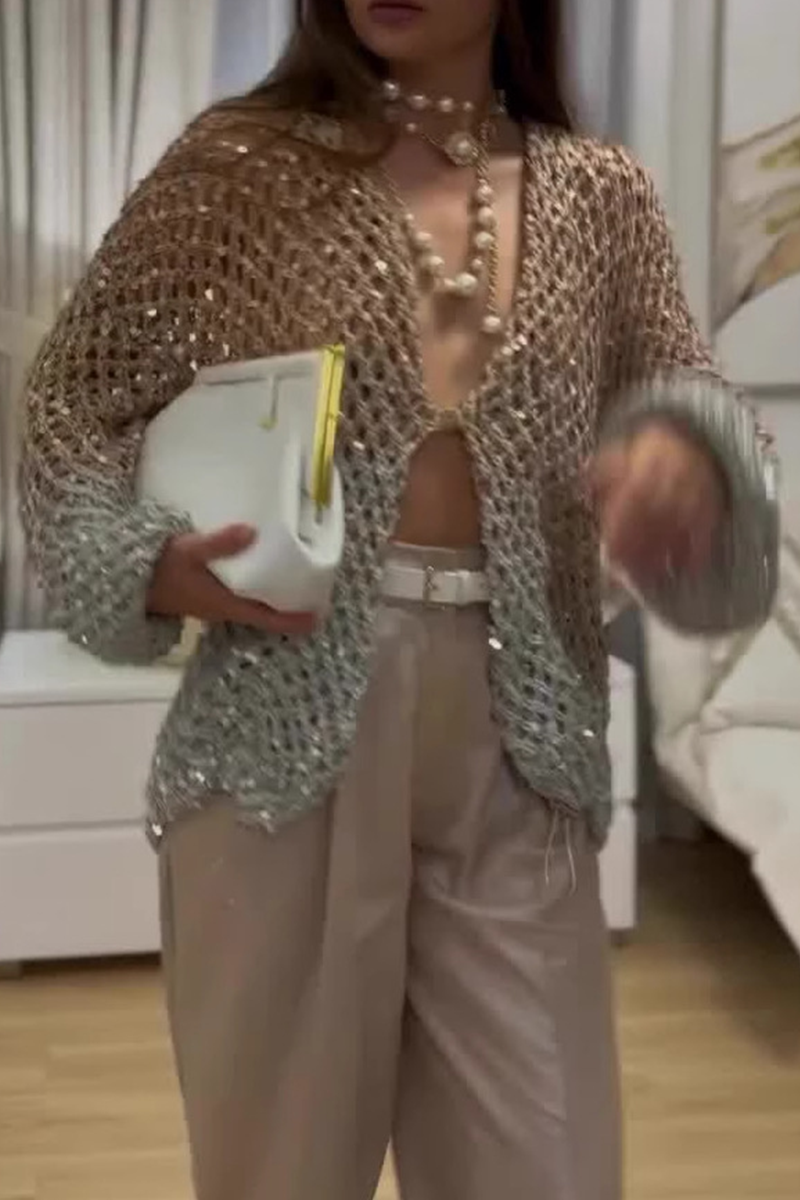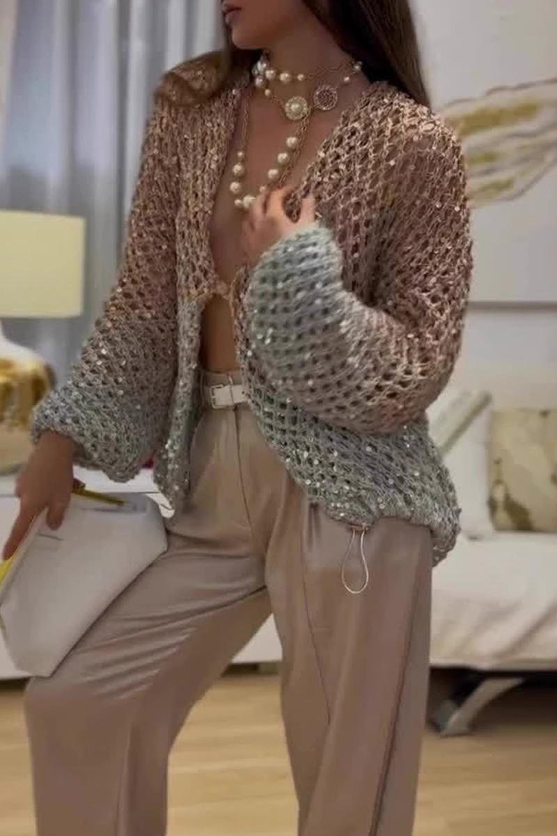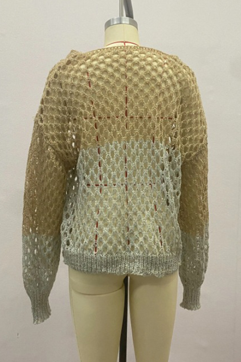 Casual Gradient Color Hollow Out Contrast V Neck Outerwear