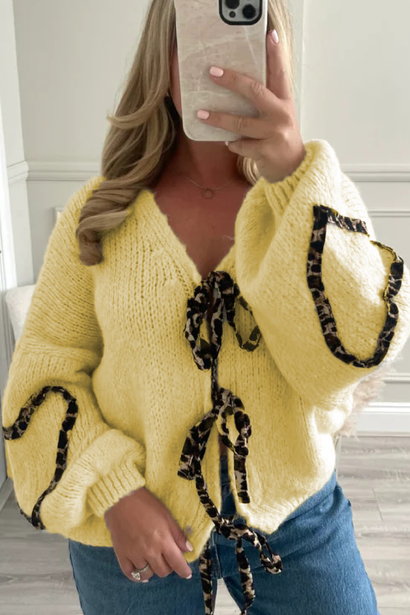 Casual Leopard Lace Up Patchwork Weave V Neck Outerwear(7 Colors)