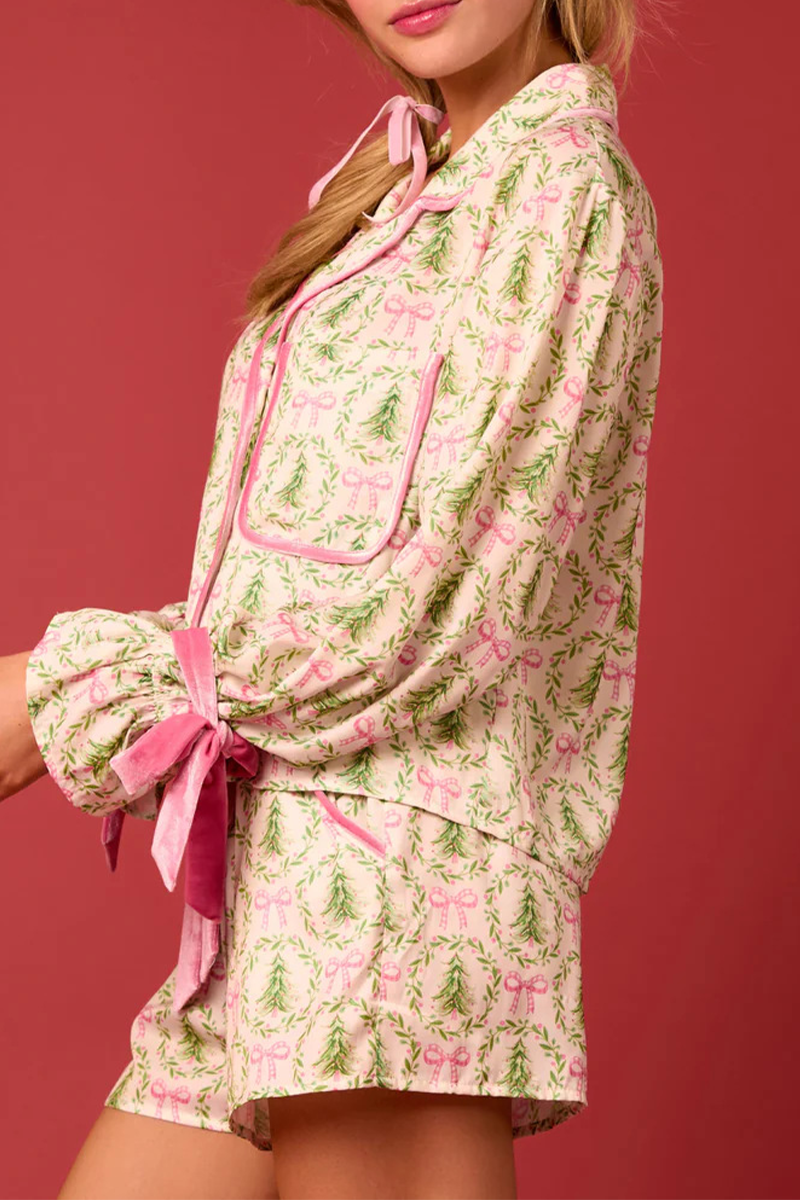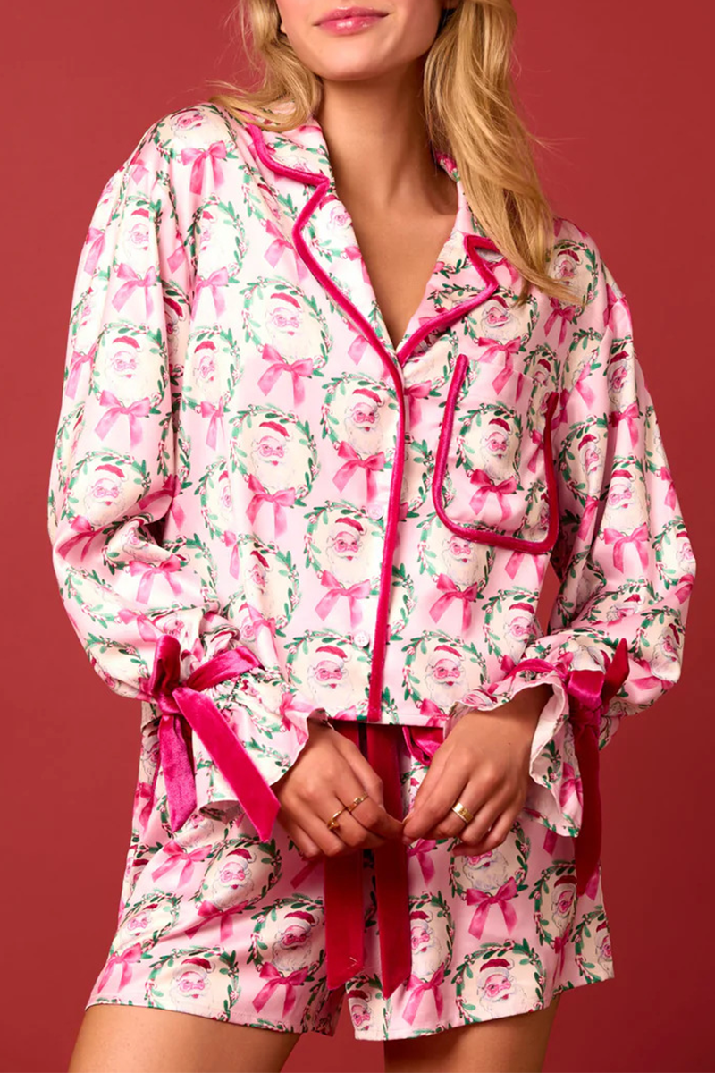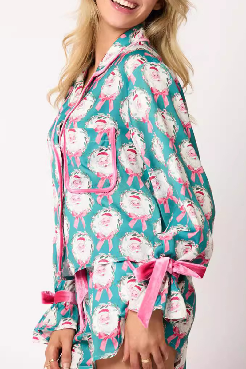 Casual Santa Claus Christmas Tree Lace Up Contrast Turndown Collar Long Sleeve Two Pieces(4 Colors)