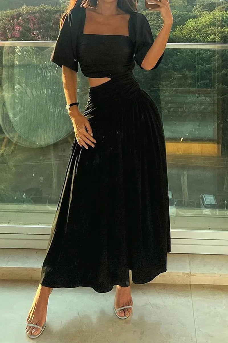 Casual Solid Color Hollow Out Ruched Square Neck A Line Short Sleeve Dress