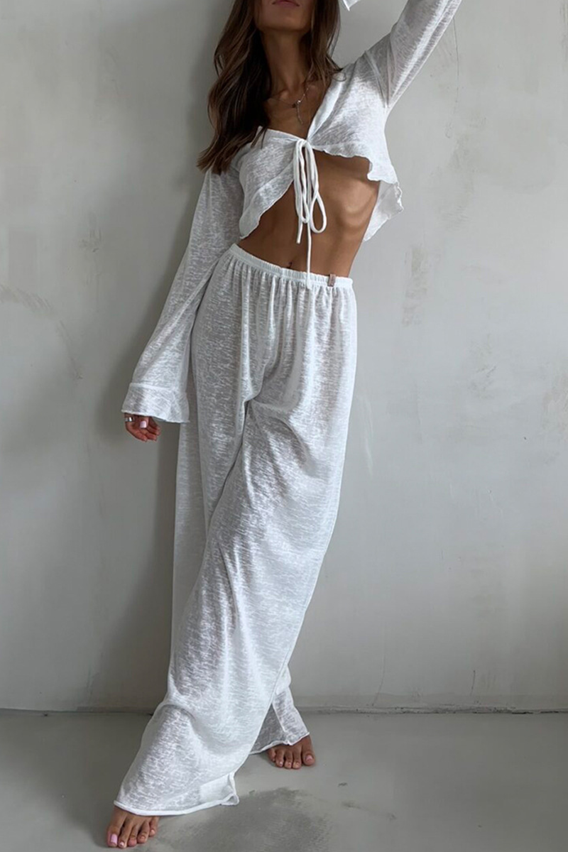 Casual Lace Up Ruffle V Neck Long Sleeve Two Pieces