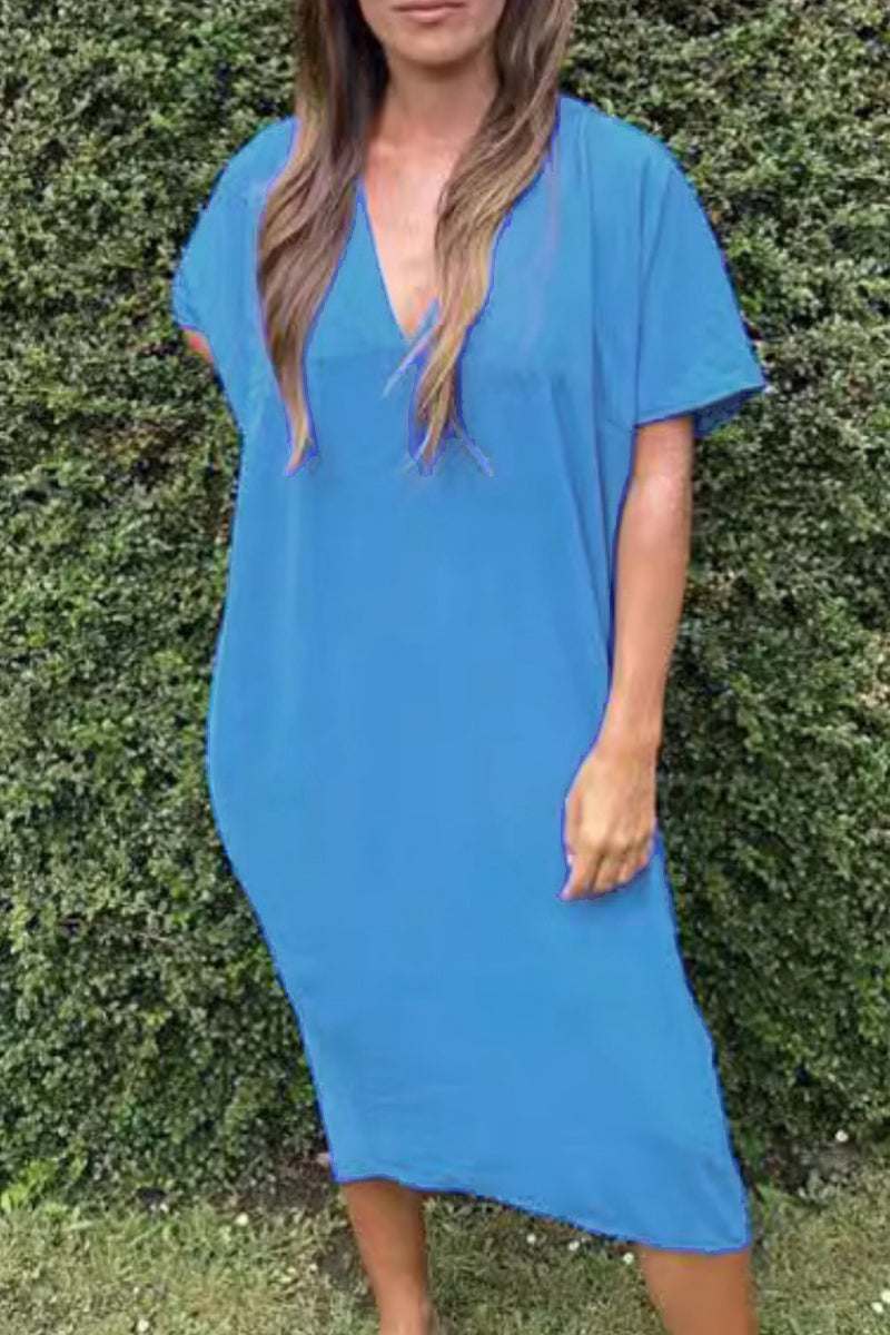 Casual Solid Color Slit V Neck Short Sleeve Short Sleeve Dress(3 Colors)