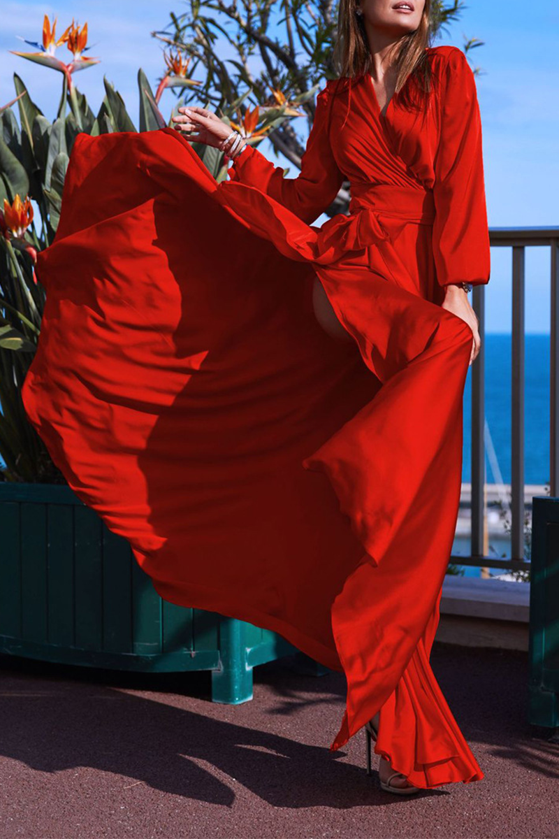 Casual Solid Slit V Neck Waist Skirt Dresses(3 Colors)