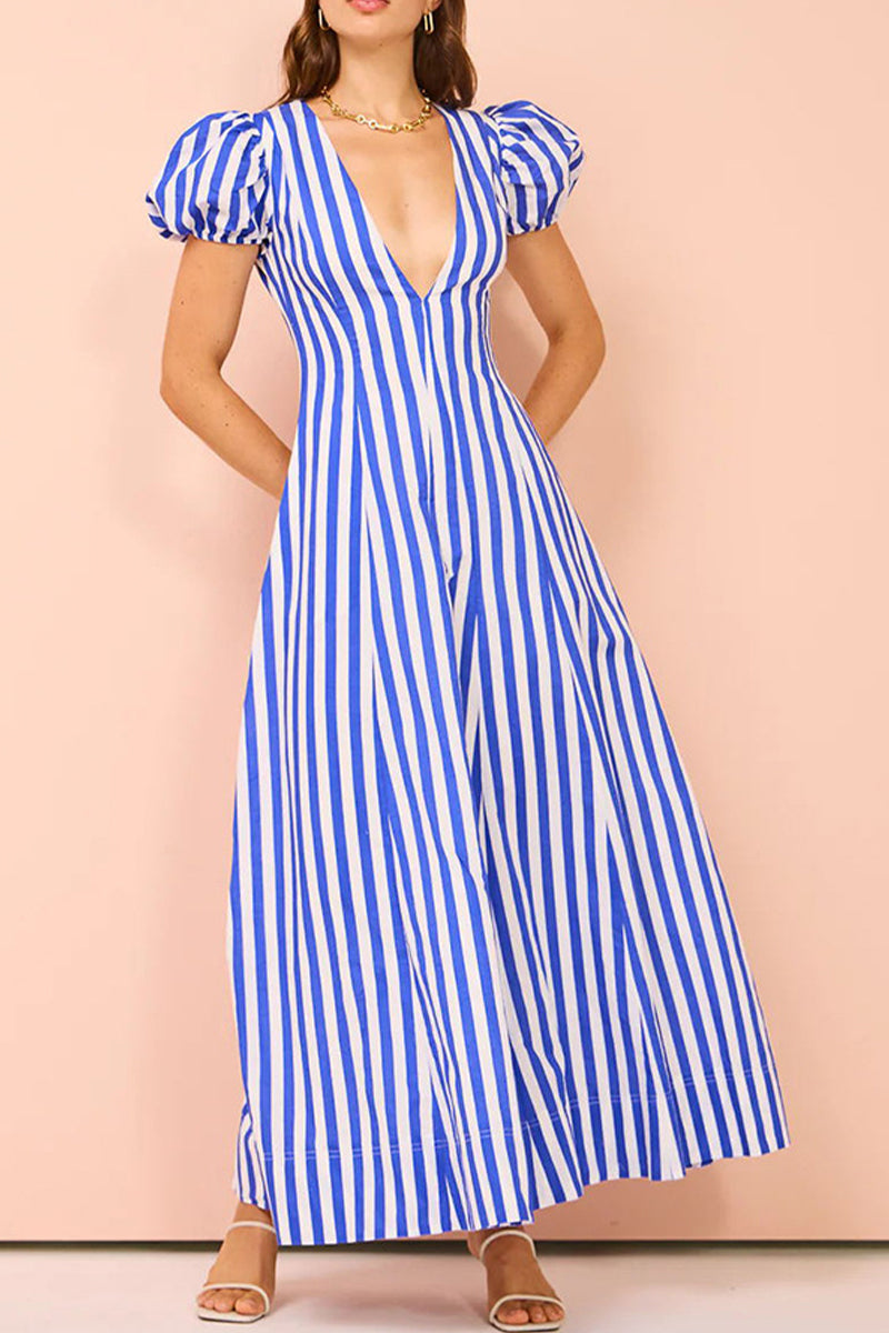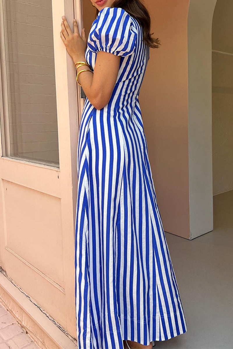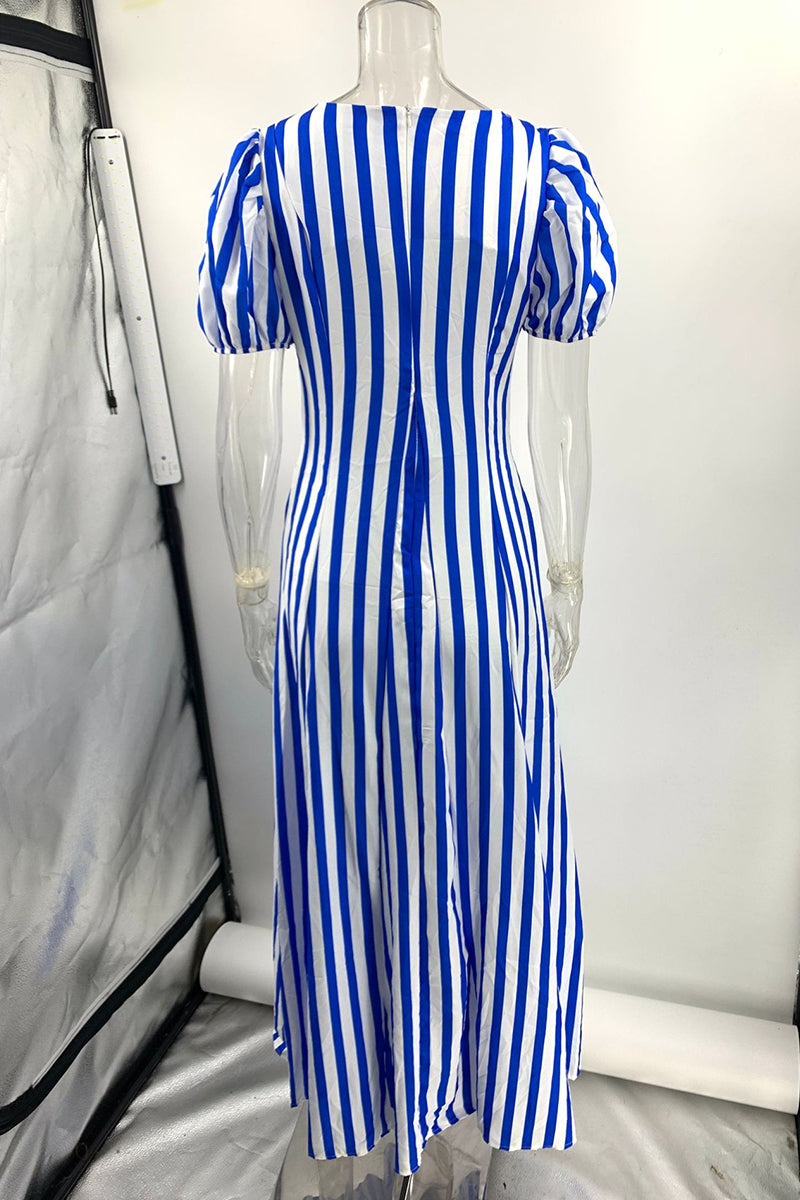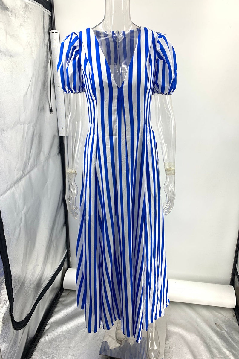 Casual Striped Print Pocket Contrast V Neck A Line Short Sleeve Dress