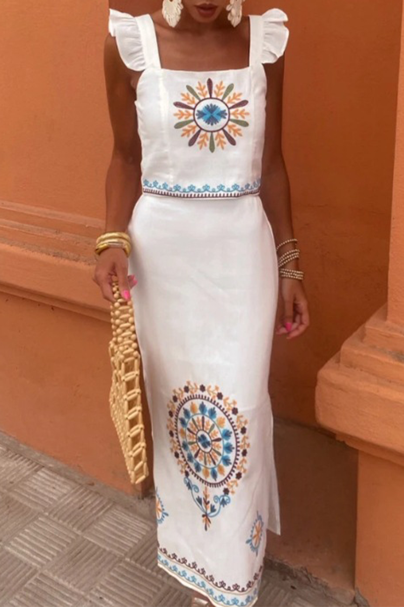 Casual Vacation Floral Print Ruffle Square Neck Two Pieces