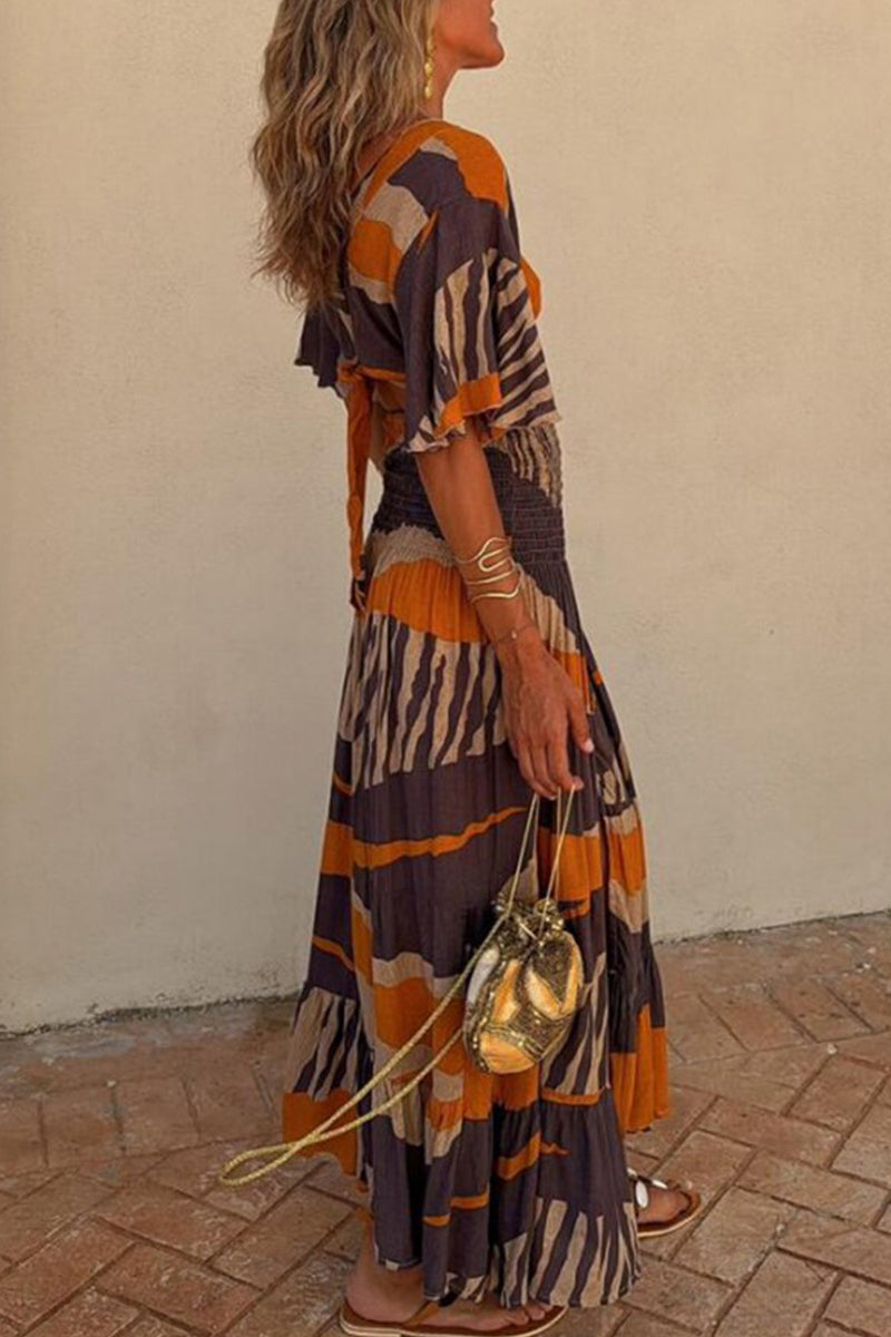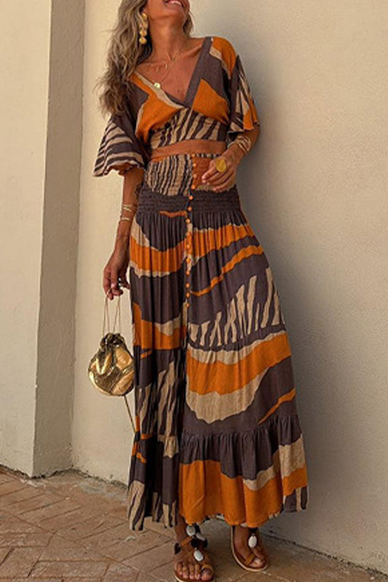 Casual Vacation Striped Print Buttons V Neck Short Sleeve Two Pieces