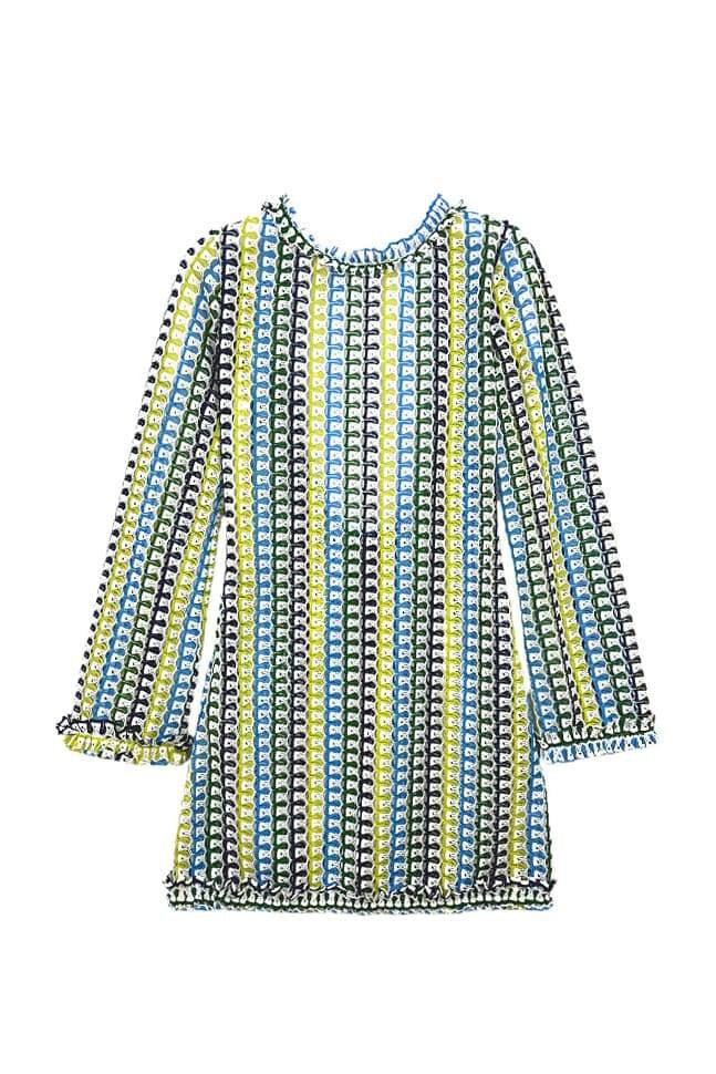 - Vertical Wavy Stripe Knit Patterns, Ruffle-trimmed Boat Neck, Open Back, Long Sleeves, Semi-Sheer, Mini Length.