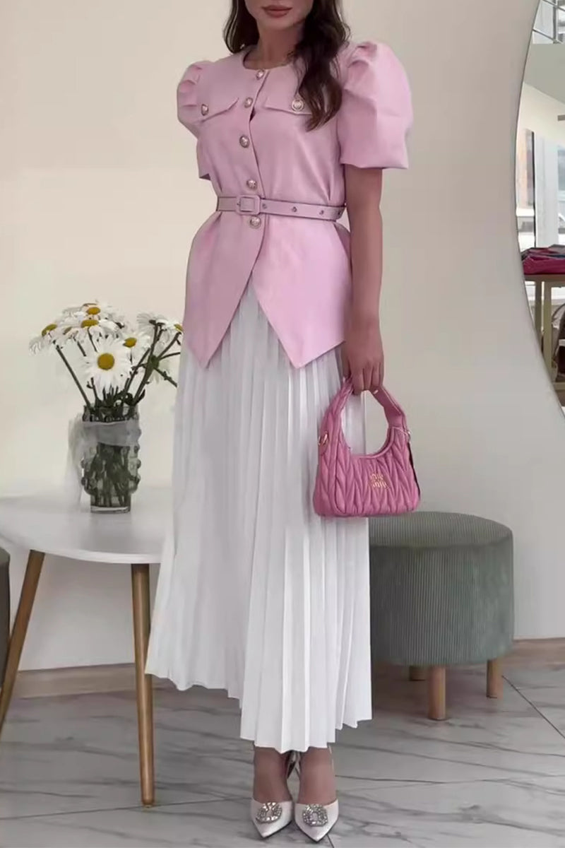 Celebrities Elegant Buttons Patchwork O Neck Short Sleeve Two Pieces(4 Colors)