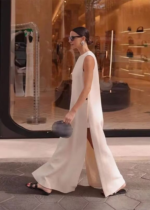 The Celeste Maxi Dress embodies understated elegance with its sleek, minimalist silhouette. Crafted from a lightweight, flowing fabric, this sleeveless design drapes beautifully, offering both comfort and sophistication. Subtle button details along the sides add a contemporary touch, while the high neckline keeps the look refined. Perfect for casual outings, workwear, or elevated evening styling, this versatile dress is a timeless wardrobe staple.