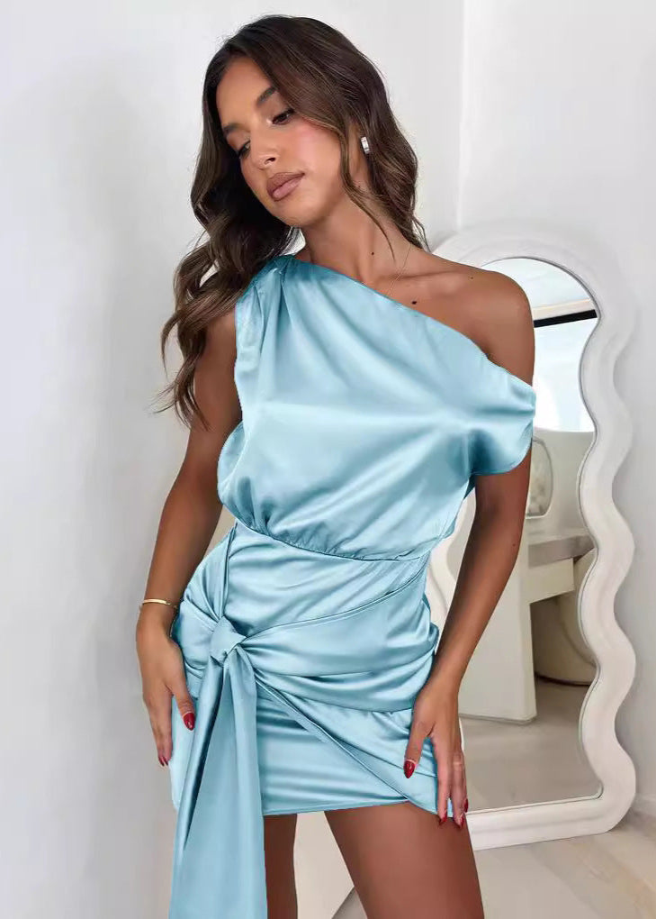Celeste - One-Shoulder Satin Mini Dress brings effortless glamour with its asymmetrical neckline and draped silhouette. Crafted from lustrous satin, this mini dress features a cinched waist with a side knot detail that enhances your curves. The relaxed one-shoulder design adds a modern touch, while the soft sheen of the fabric creates an elegant finish. Perfect for cocktail parties, date nights, and special occasions, this dress pairs beautifully with strappy heels and minimal jewelry for a refined yet alluring look.