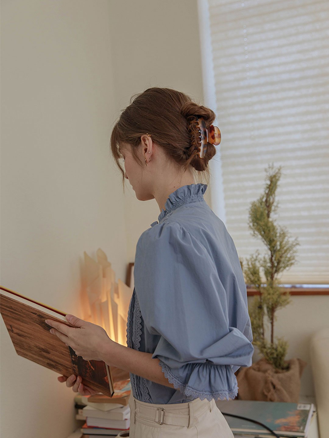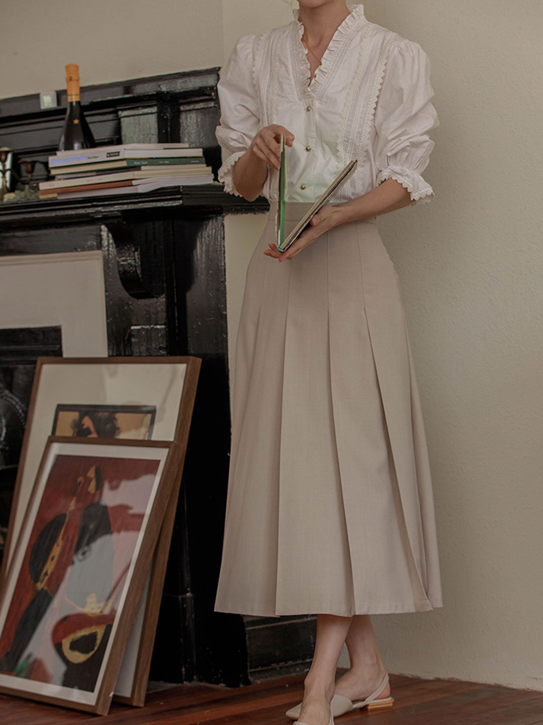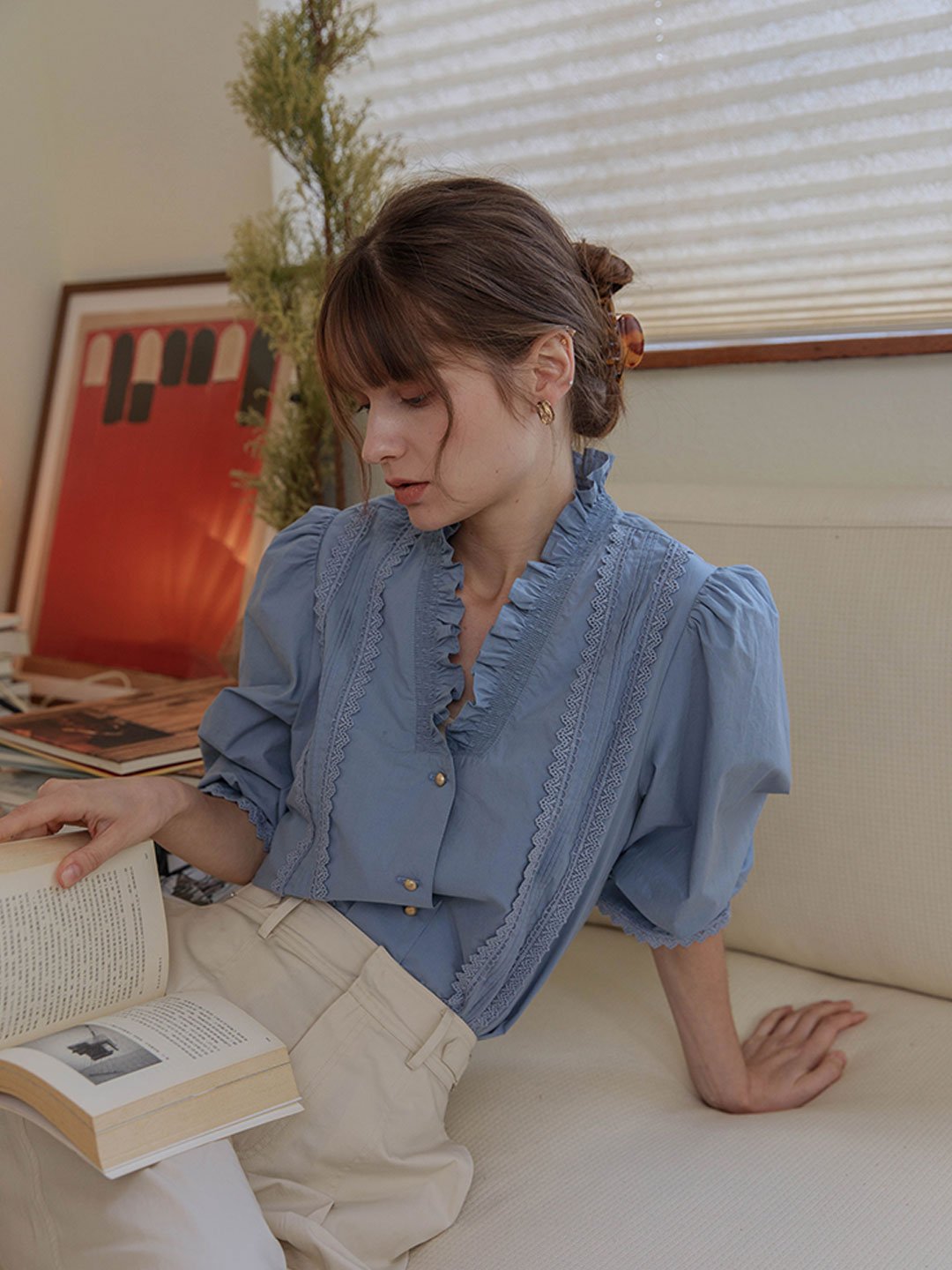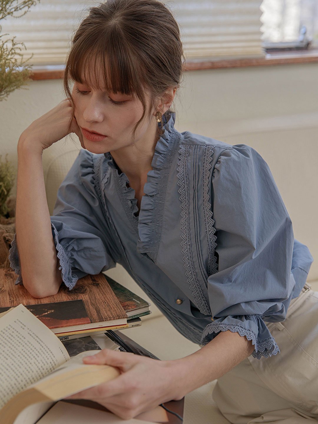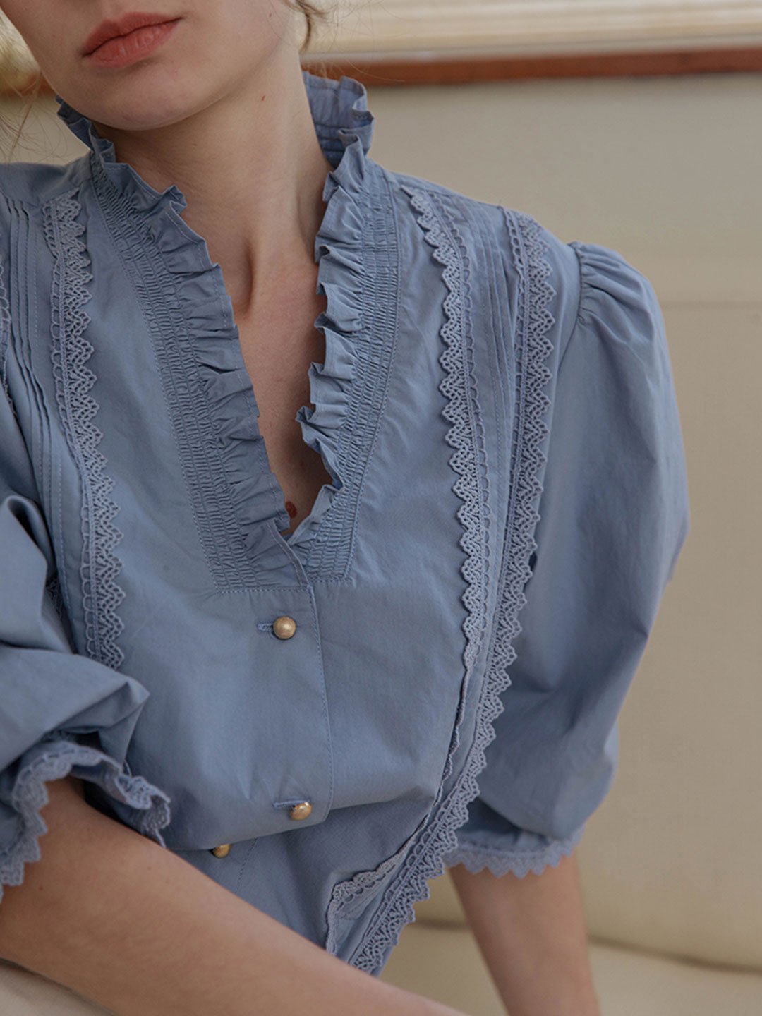 Cara V-neck Retro Lantern Sleeve Lace Blouse-White