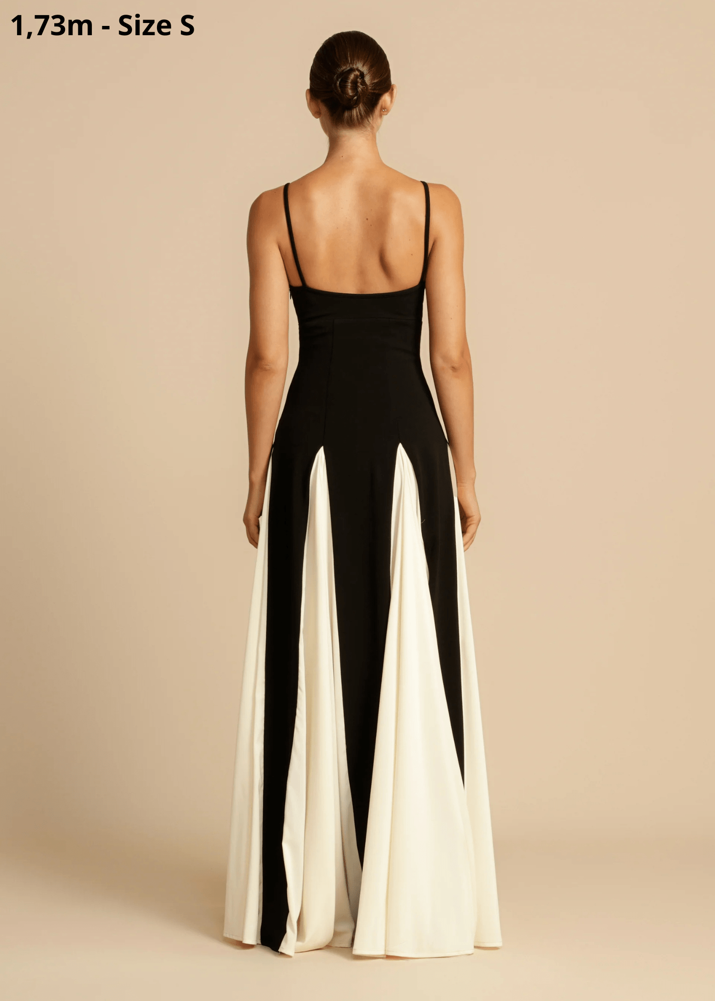 Slip into this dress and immediately feel the confidence and power it inspires. With its sophisticated design and bold contrasts, it ensures you'll always stand out. Picture yourself in the spotlight, radiant and elegant, capturing every gaze.