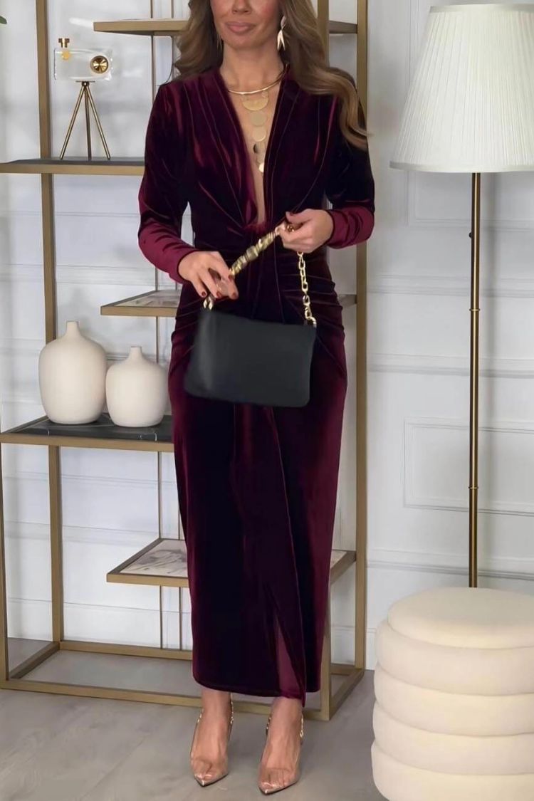 Classic Elegant Pleated Deep V Slit Party Maxi Dress