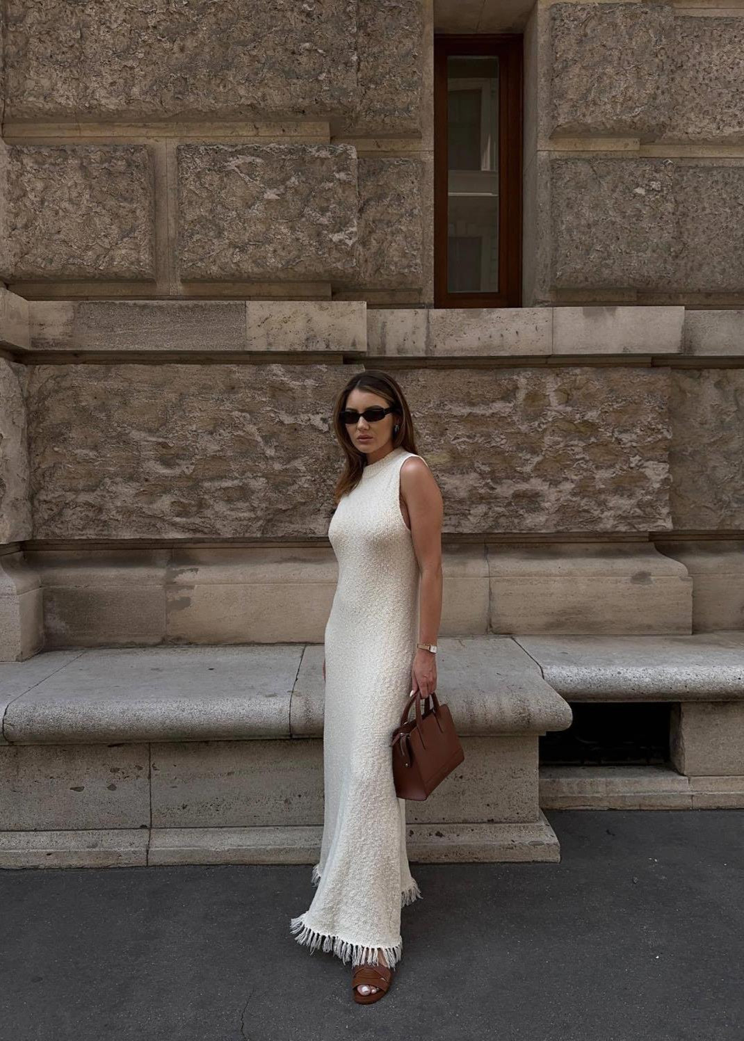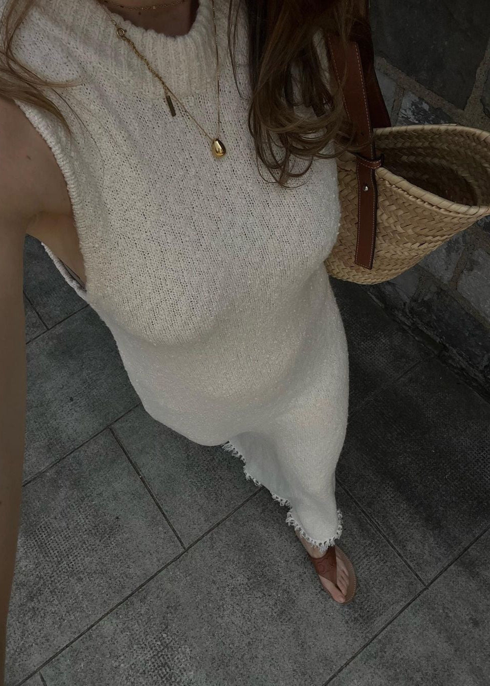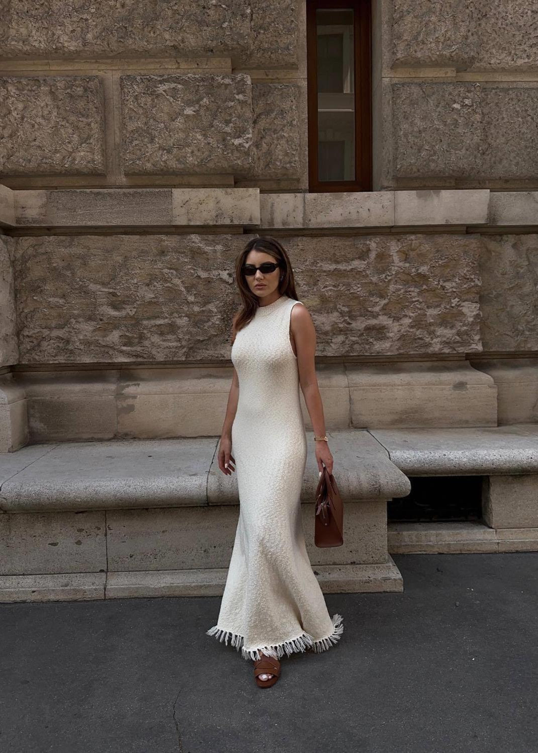 The Coastal Thread dress blends coastal minimalism with textured elegance. Crafted from a soft, stretch-knit fabric, it features a high crew neckline, sleeveless silhouette, and a subtle straight-line fit. The fringe hem adds movement and laid-back charm, making it perfect for beachside evenings, warm city days, or casual resort getaways.