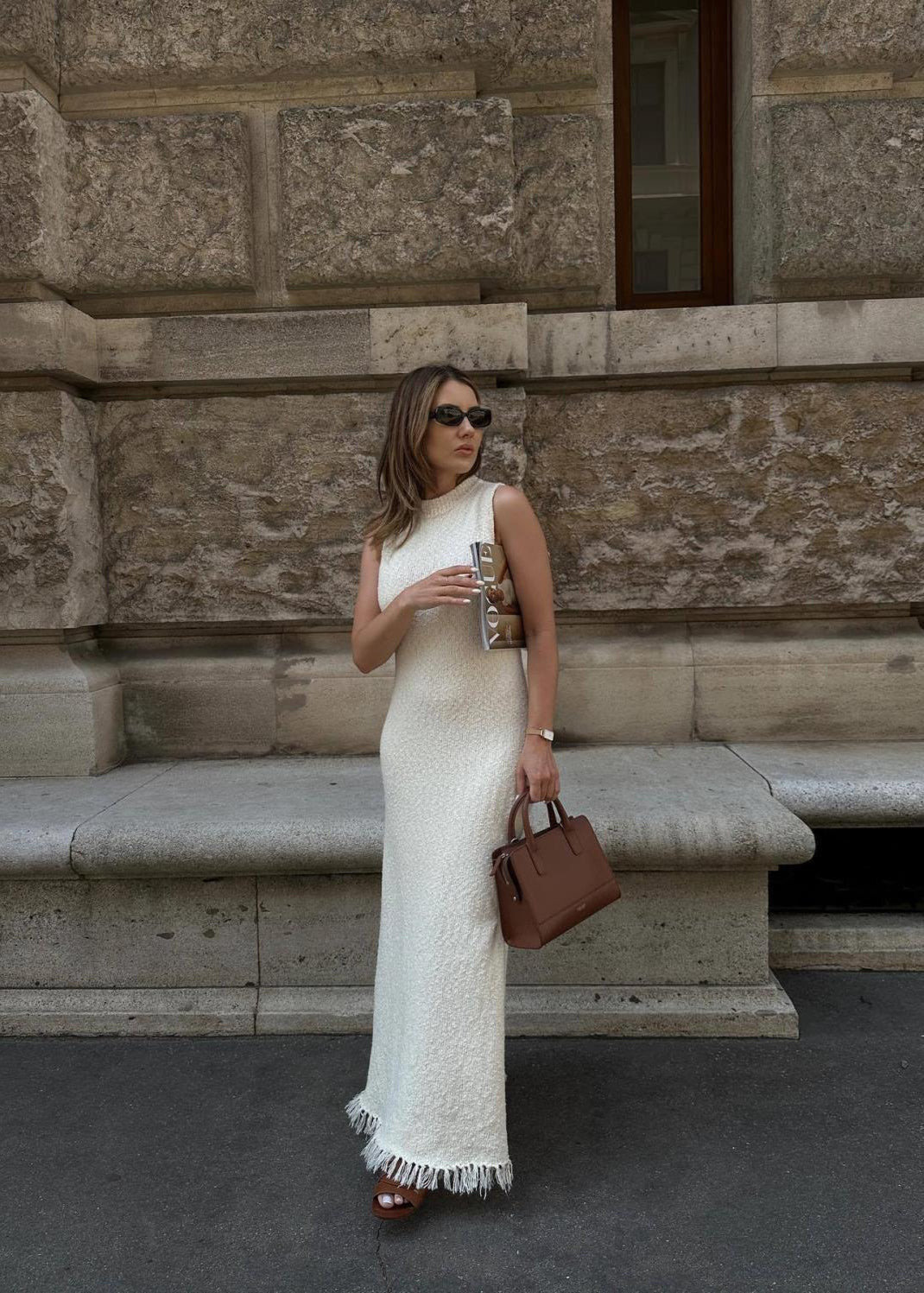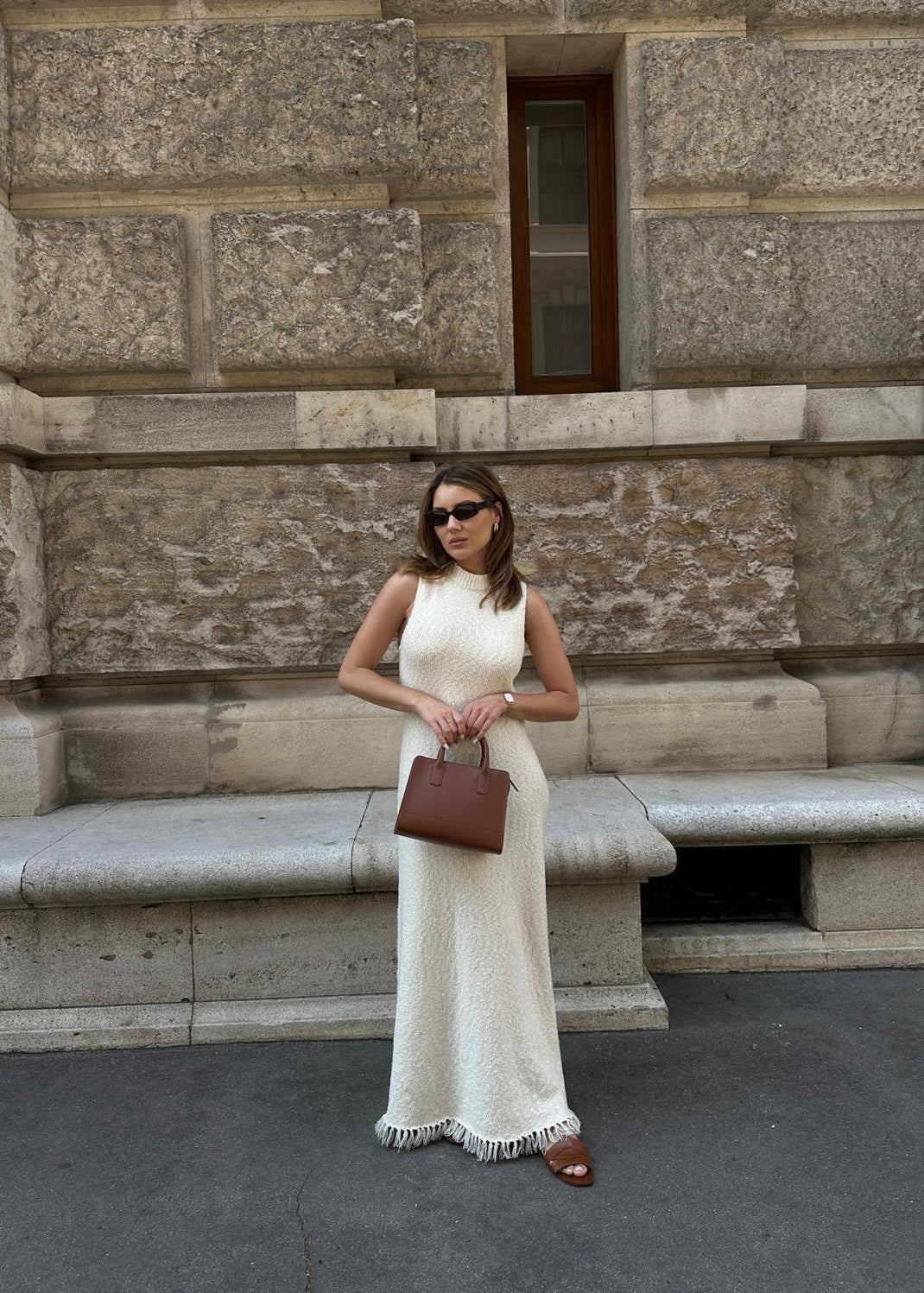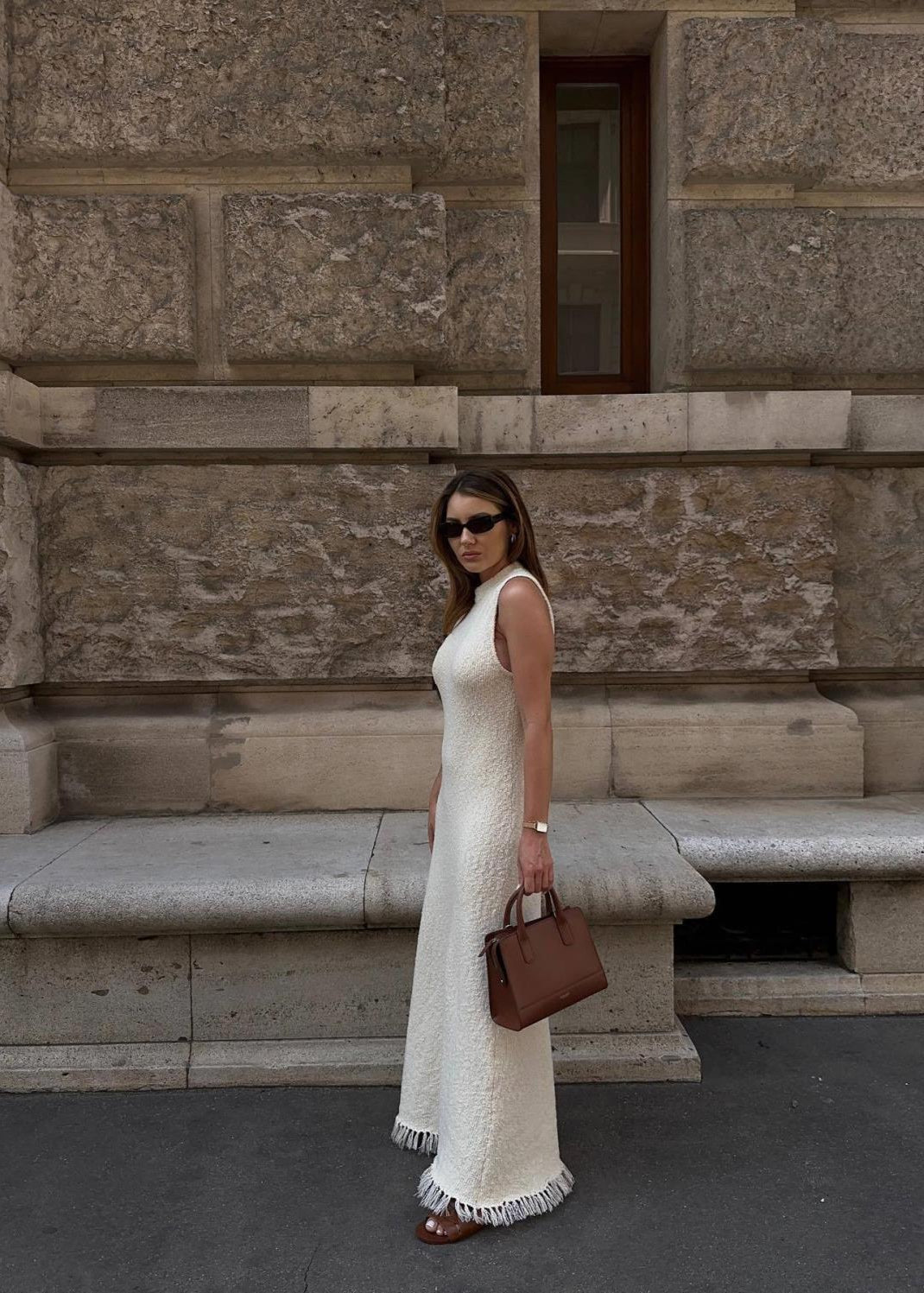 The Coastal Thread dress blends coastal minimalism with textured elegance. Crafted from a soft, stretch-knit fabric, it features a high crew neckline, sleeveless silhouette, and a subtle straight-line fit. The fringe hem adds movement and laid-back charm, making it perfect for beachside evenings, warm city days, or casual resort getaways.