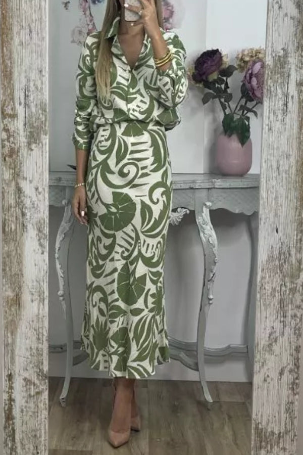 - Conjunto de camisa y falda. La camisa es de corte recto a abotonada con el cuello y los puños entretelados. La falda lleva goma en la cintura y es pegada hasta la cadera y después se abre