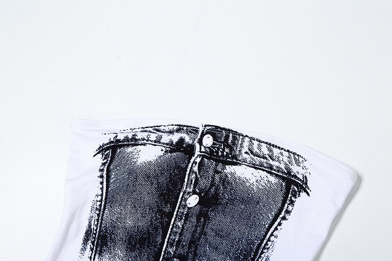 Contrast denim print slit backless tube maxi skirt set-final-sale