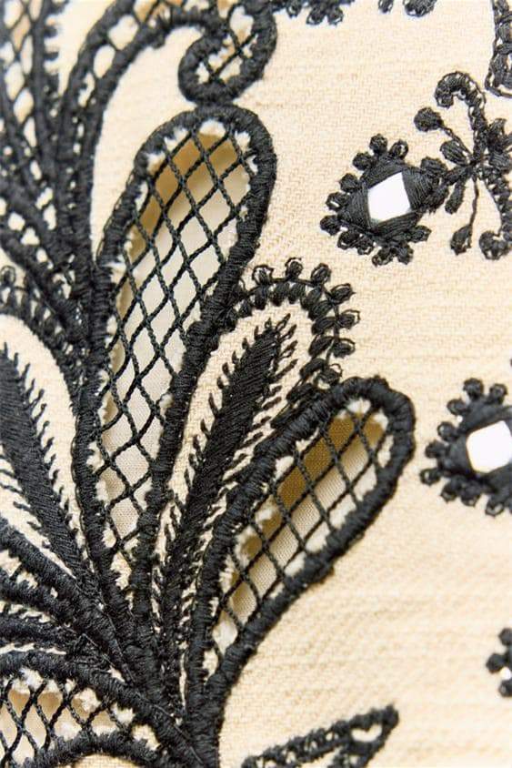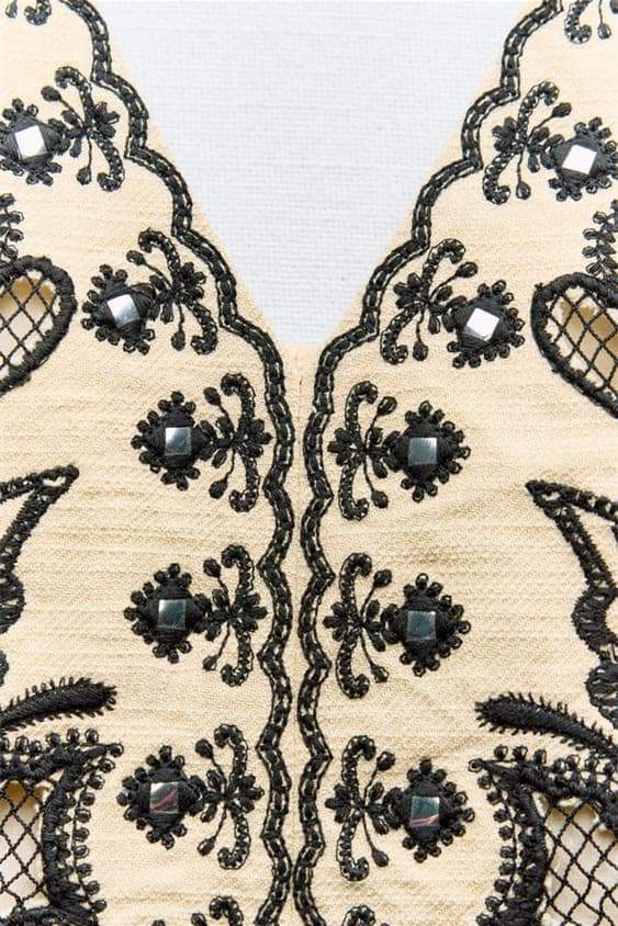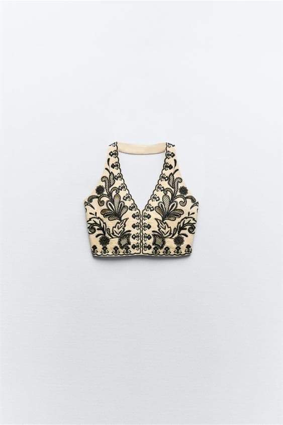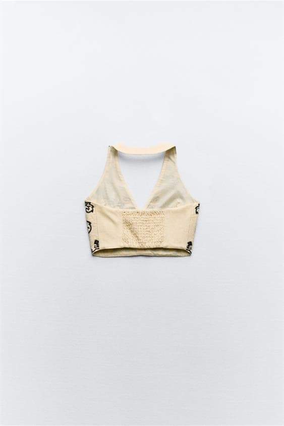- Halter Neck Crop Top, V-neckline, Embroidery Details, Mirror-effect Appliqu��.