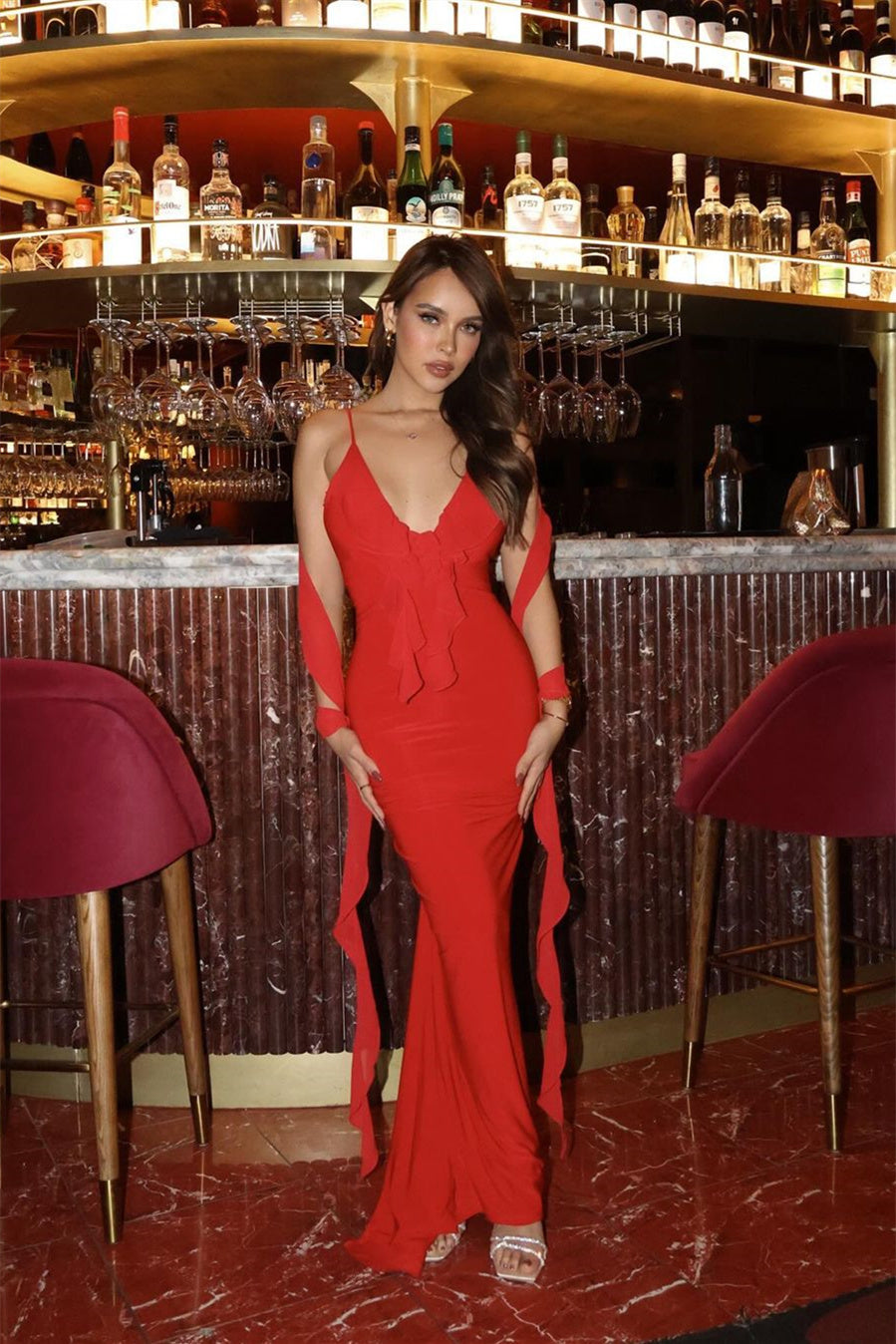 - V-neck, Adjustable Straps, Fixed Front Flower, Back Ruffles, Floor Length.