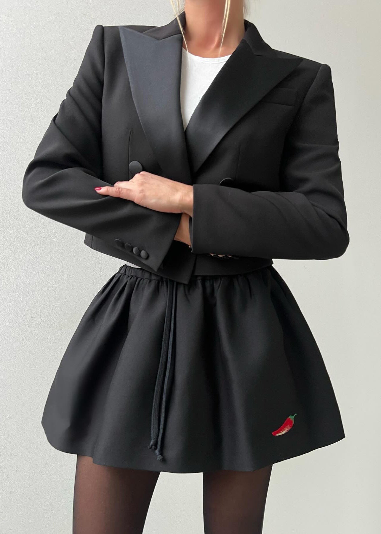 Cropped Tuxedo Blazer & Drawstring Mini Skirt Set – a refined take on power dressing with a playful twist. The structured blazer features a sleek satin lapel and a cropped silhouette, offering a modern, tailored fit. Paired with a high-waisted mini skirt with an adjustable drawstring and a subtle embroidered chili pepper detail, this set blends sophistication with a touch of boldness. Wear together for a striking statement or mix and match with wardrobe staples for versatile styling.