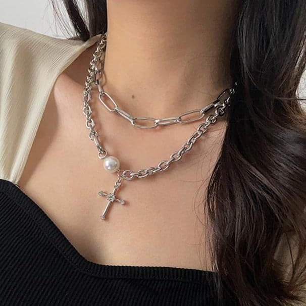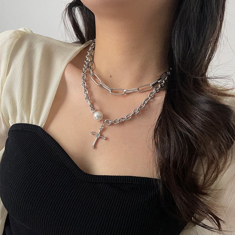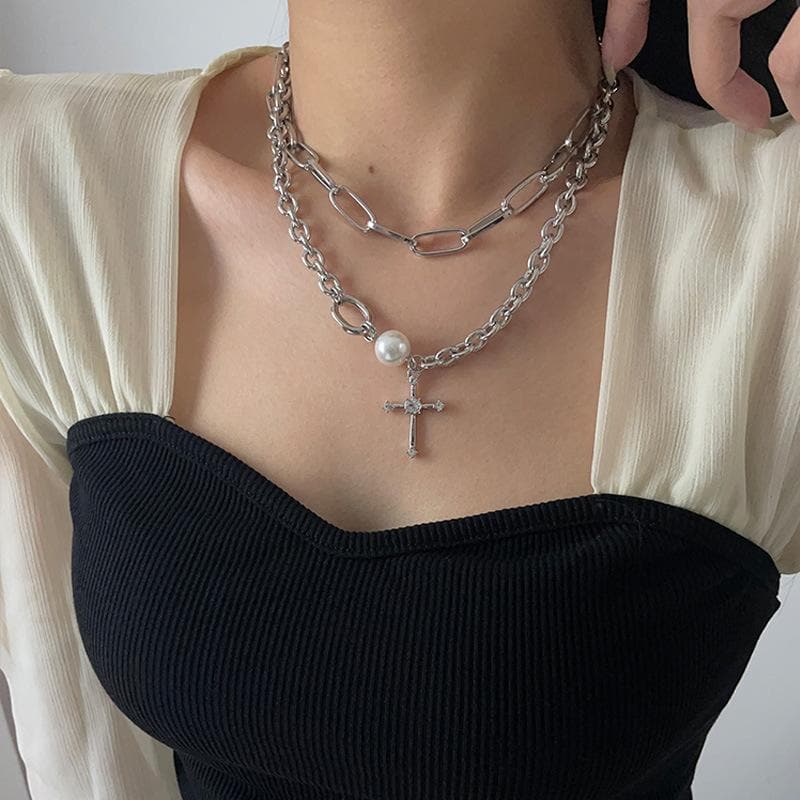 Cross faux pearl layered chain choker necklace